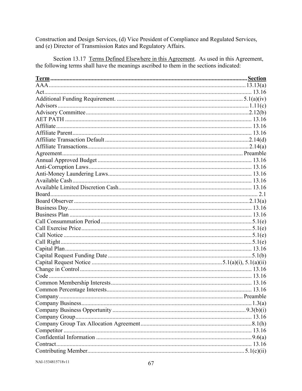 NAI-1534815718v11 67 Construction and Design Services, (d) Vice President of Compliance and Regulated Services, and (e) Director of Transmission Rates and Regulatory Affairs. Section 13.17 Terms Defined Elsewhere in this Agreement. As used in this Agreement, the following terms shall have the meanings ascribed to them in the sections indicated: Term ..................................................................................................................................... Section AAA ..................................................................................................................................... 13.13(a) Act ............................................................................................................................................ 13.16 Additional Funding Requirement. ..................................................................................... 5.1(a)(iv) Advisors ................................................................................................................................. 1.11(c) Advisory Committee .............................................................................................................. 2.12(b) AET PATH .............................................................................................................................. 13.16 Affiliate .................................................................................................................................... 13.16 Affiliate Parent ......................................................................................................................... 13.16 Affiliate Transaction Default ................................................................................................. 2.14(d) Affiliate Transactions ............................................................................................................. 2.14(a) Agreement .......................................................................................................................... Preamble Annual Approved Budget ........................................................................................................ 13.16 Anti-Corruption Laws .............................................................................................................. 13.16 Anti-Money Laundering Laws ................................................................................................. 13.16 Available Cash ......................................................................................................................... 13.16 Available Limited Discretion Cash .......................................................................................... 13.16 Board ............................................................................................................................................ 2.1 Board Observer ...................................................................................................................... 2.13(a) Business Day ............................................................................................................................ 13.16 Business Plan ........................................................................................................................... 13.16 Call Consummation Period ...................................................................................................... 5.1(e) Call Exercise Price ................................................................................................................... 5.1(e) Call Notice ............................................................................................................................... 5.1(e) Call Right ................................................................................................................................. 5.1(e) Capital Plan .............................................................................................................................. 13.16 Capital Request Funding Date ................................................................................................. 5.1(b) Capital Request Notice ........................................................................................ 5.1(a)(i), 5.1(a)(ii) Change in Control .................................................................................................................... 13.16 Code ......................................................................................................................................... 13.16 Common Membership Interests ............................................................................................... 13.16 Common Percentage Interests .................................................................................................. 13.16 Company ............................................................................................................................ Preamble Company Business ................................................................................................................... 1.3(a) Company Business Opportunity .......................................................................................... 9.3(b)(i) Company Group ....................................................................................................................... 13.16 Company Group Tax Allocation Agreement ........................................................................... 8.1(h) Competitor ............................................................................................................................... 13.16 Confidential Information ......................................................................................................... 9.6(a) Contract .................................................................................................................................... 13.16 Contributing Member.................