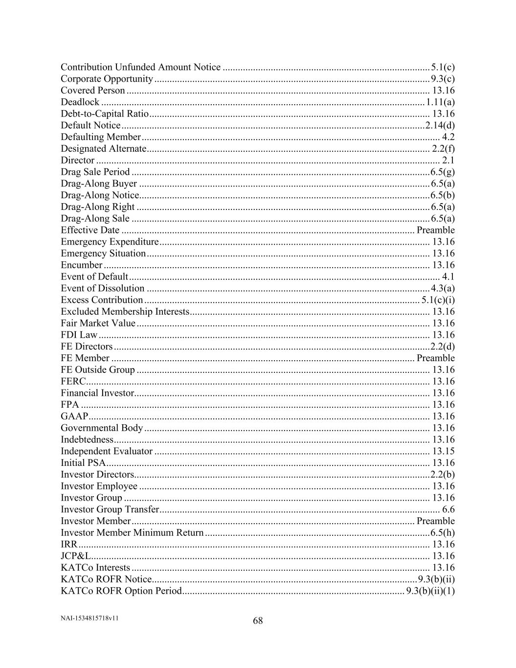 NAI-1534815718v11 68 Contribution Unfunded Amount Notice .................................................................................. 5.1(c) Corporate Opportunity ............................................................................................................. 9.3(c) Covered Person ........................................................................................................................ 13.16 Deadlock ................................................................................................................................ 1.11(a) Debt-to-Capital Ratio ............................................................................................................... 13.16 Default Notice ........................................................................................................................ 2.14(d) Defaulting Member ...................................................................................................................... 4.2 Designated Alternate ................................................................................................................ 2.2(f) Director ........................................................................................................................................ 2.1 Drag Sale Period ...................................................................................................................... 6.5(g) Drag-Along Buyer ................................................................................................................... 6.5(a) Drag-Along Notice ................................................................................................................... 6.5(b) Drag-Along Right .................................................................................................................... 6.5(a) Drag-Along Sale ...................................................................................................................... 6.5(a) Effective Date .................................................................................................................... Preamble Emergency Expenditure ........................................................................................................... 13.16 Emergency Situation ................................................................................................................ 13.16 Encumber ................................................................................................................................. 13.16 Event of Default ........................................................................................................................... 4.1 Event of Dissolution ................................................................................................................ 4.3(a) Excess Contribution ............................................................................................................. 5.1(c)(i) Excluded Membership Interests ............................................................................................... 13.16 Fair Market Value .................................................................................................................... 13.16 FDI Law ................................................................................................................................... 13.16 FE Directors ............................................................................................................................. 2.2(d) FE Member ........................................................................................................................ Preamble FE Outside Group .................................................................................................................... 13.16 FERC........................................................................................................................................ 13.16 Financial Investor..................................................................................................................... 13.16 FPA .......................................................................................................................................... 13.16 GAAP ....................................................................................................................................... 13.16 Governmental Body ................................................................................................................. 13.16 Indebtedness ............................................................................................................................. 13.16 Independent Evaluator ............................................................................................................. 13.15 Initial PSA ................................................................................................................................ 13.16 Investor Directors..................................................................................................................... 2.2(b) Investor Employee ................................................................................................................... 13.16 Investor Group ......................................................................................................................... 13.16 Investor Group Transfer ............................................................................................................... 6.6 Investor Member ................................................................................................................ Preamble Investor Member Minimum Return ......................................................................................... 6.5(h) IRR ........................................................................................................................................... 13.16 JCP&L...............................