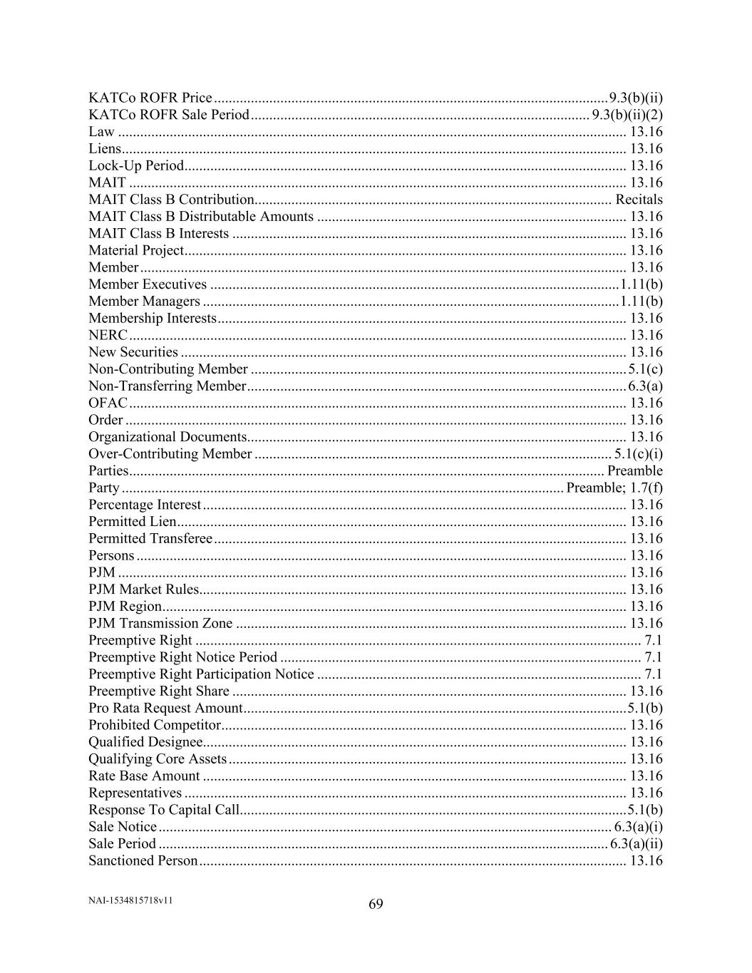 NAI-1534815718v11 69 KATCo ROFR Price ........................................................................................................... 9.3(b)(ii) KATCo ROFR Sale Period ............................................................................................ 9.3(b)(ii)(2) Law .......................................................................................................................................... 13.16 Liens ......................................................................................................................................... 13.16 Lock-Up Period ........................................................................................................................ 13.16 MAIT ....................................................................................................................................... 13.16 MAIT Class B Contribution................................................................................................. Recitals MAIT Class B Distributable Amounts .................................................................................... 13.16 MAIT Class B Interests ........................................................................................................... 13.16 Material Project ........................................................................................................................ 13.16 Member .................................................................................................................................... 13.16 Member Executives ............................................................................................................... 1.11(b) Member Managers ................................................................................................................. 1.11(b) Membership Interests ............................................................................................................... 13.16 NERC ....................................................................................................................................... 13.16 New Securities ......................................................................................................................... 13.16 Non-Contributing Member ...................................................................................................... 5.1(c) Non-Transferring Member ....................................................................................................... 6.3(a) OFAC ....................................................................................................................................... 13.16 Order ........................................................................................................................................ 13.16 Organizational Documents ....................................................................................................... 13.16 Over-Contributing Member ................................................................................................. 5.1(c)(i) Parties ................................................................................................................................. Preamble Party ........................................................................................................................ Preamble; 1.7(f) Percentage Interest ................................................................................................................... 13.16 Permitted Lien .......................................................................................................................... 13.16 Permitted Transferee ................................................................................................................ 13.16 Persons ..................................................................................................................................... 13.16 PJM .......................................................................................................................................... 13.16 PJM Market Rules.................................................................................................................... 13.16 PJM Region .............................................................................................................................. 13.16 PJM Transmission Zone .......................................................................................................... 13.16 Preemptive Right ......................................................................................................................... 7.1 Preemptive Right Notice Period .................................................................................................. 7.1 Preemptive Right Participation Notice ........................................................................................ 7.1 Preemptive Right Share ........................................................................................................... 13.16 Pro Rata Request Amount ........................................................................................................ 5.1(b) Prohibited Competitor .............................................................................................................. 13.16 Qualified Designee................................................................................................................... 13.16 Qualifying Core Assets ............................................................................................................ 13.16 Rate Base Amount ................................................................................................................... 13.16 Representatives ........................................................................................................................ 13.16 Response To Capital Call..................................................................