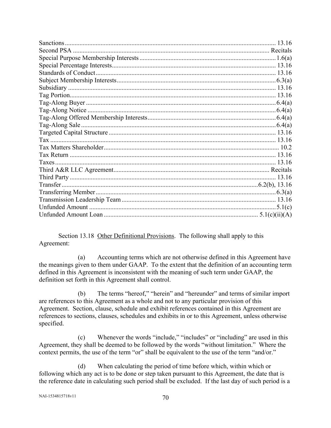 NAI-1534815718v11 70 Sanctions .................................................................................................................................. 13.16 Second PSA ......................................................................................................................... Recitals Special Purpose Membership Interests .................................................................................... 1.6(a) Special Percentage Interests ..................................................................................................... 13.16 Standards of Conduct ............................................................................................................... 13.16 Subject Membership Interests .................................................................................................. 6.3(a) Subsidiary ................................................................................................................................ 13.16 Tag Portion............................................................................................................................... 13.16 Tag-Along Buyer ..................................................................................................................... 6.4(a) Tag-Along Notice .................................................................................................................... 6.4(a) Tag-Along Offered Membership Interests ............................................................................... 6.4(a) Tag-Along Sale ........................................................................................................................ 6.4(a) Targeted Capital Structure ....................................................................................................... 13.16 Tax ........................................................................................................................................... 13.16 Tax Matters Shareholder ............................................................................................................ 10.2 Tax Return ............................................................................................................................... 13.16 Taxes ........................................................................................................................................ 13.16 Third A&R LLC Agreement ................................................................................................ Recitals Third Party ............................................................................................................................... 13.16 Transfer ......................................................................................................................... 6.2(b), 13.16 Transferring Member ............................................................................................................... 6.3(a) Transmission Leadership Team ............................................................................................... 13.16 Unfunded Amount ................................................................................................................... 5.1(c) Unfunded Amount Loan ............................................................................................... 5.1(c)(ii)(A) Section 13.18 Other Definitional Provisions. The following shall apply to this Agreement: (a) Accounting terms which are not otherwise defined in this Agreement have the meanings given to them under GAAP. To the extent that the definition of an accounting term defined in this Agreement is inconsistent with the meaning of such term under GAAP, the definition set forth in this Agreement shall control. (b) The terms “hereof,” “herein” and “hereunder” and terms of similar import are references to this Agreement as a whole and not to any particular provision of this Agreement. Section, clause, schedule and exhibit references contained in this Agreement are references to sections, clauses, schedules and exhibits in or to this Agreement, unless otherwise specified. (c) Whenever the words “include,” “includes” or “including” are used in this Agreement, they shall be deemed to be followed by the words “without limitation.” Where the context permits, the use of the term “or” shall be equivalent to the use of the term “and/or.” (d) When calculating the period of time before which, within which or following which any act is to be done or step taken pursuant to this Agreement, the date that is the reference date in calculating such period shall be excluded. If the last day of such period is a