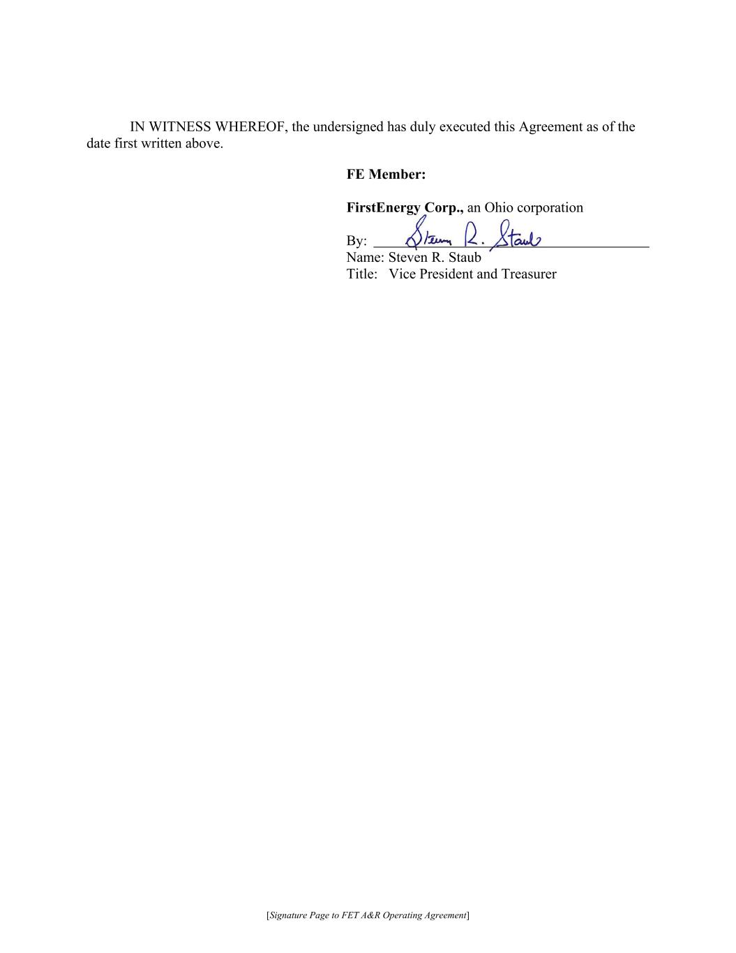 IN WITNESS WHEREOF, the undersigned has duly executed this Agreement as of the date first written above. FE Member: FirstEnergy Corp., an Ohio corporation By: Name: Steven R. Staub Title: Vice President and Treasurer [Signature Page to FET A&R Operating Agreement]