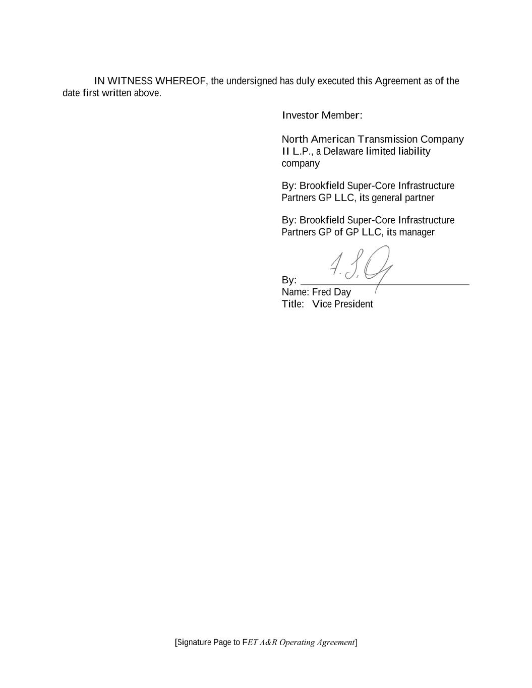 [Signature Page to FET A&R Operating Agreement] IN WITNESS WHEREOF, the undersigned has duly executed this Agreement as of the date first written above. Investor Member: North American Transmission Company II L.P., a Delaware limited liability company By: Brookfield Super-Core Infrastructure Partners GP LLC, its general partner By: Brookfield Super-Core Infrastructure Partners GP of GP LLC, its manager By: Name: Fred Day Title: Vice President