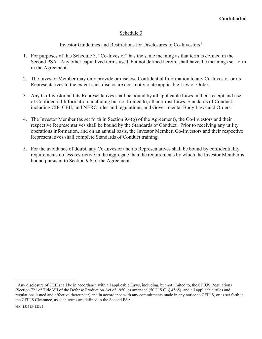 NAI-1535134123v2 Confidential Schedule 3 Investor Guidelines and Restrictions for Disclosures to Co-Investors1 1. For purposes of this Schedule 3, “Co-Investor” has the same meaning as that term is defined in the Second PSA. Any other capitalized terms used, but not defined herein, shall have the meanings set forth in the Agreement. 2. The Investor Member may only provide or disclose Confidential Information to any Co-Investor or its Representatives to the extent such disclosure does not violate applicable Law or Order. 3. Any Co-Investor and its Representatives shall be bound by all applicable Laws in their receipt and use of Confidential Information, including but not limited to, all antitrust Laws, Standards of Conduct, including CIP, CEII, and NERC rules and regulations, and Governmental Body Laws and Orders. 4. The Investor Member (as set forth in Section 9.4(g) of the Agreement), the Co-Investors and their respective Representatives shall be bound by the Standards of Conduct. Prior to receiving any utility operations information, and on an annual basis, the Investor Member, Co-Investors and their respective Representatives shall complete Standards of Conduct training. 5. For the avoidance of doubt, any Co-Investor and its Representatives shall be bound by confidentiality requirements no less restrictive in the aggregate than the requirements by which the Investor Member is bound pursuant to Section 9.6 of the Agreement. 1 Any disclosure of CEII shall be in accordance with all applicable Laws, including, but not limited to, the CFIUS Regulations (Section 721 of Title VII of the Defense Production Act of 1950, as amended (50 U.S.C. § 4565), and all applicable rules and regulations issued and effective thereunder) and in accordance with any commitments made in any notice to CFIUS, or as set forth in the CFIUS Clearance, as such terms are defined in the Second PSA.
