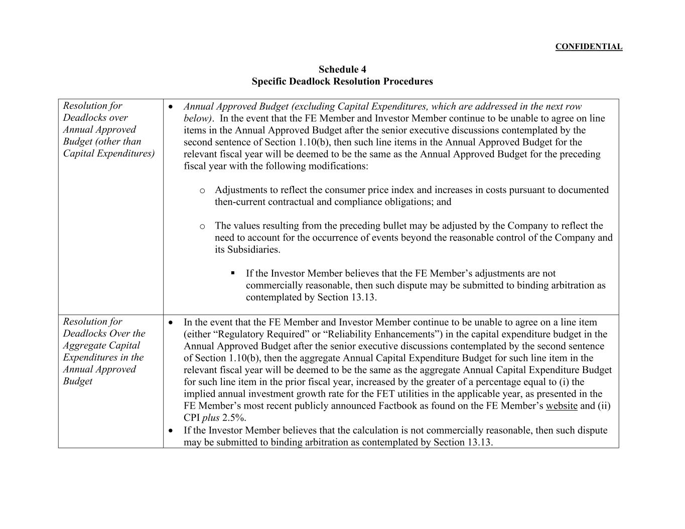 CONFIDENTIAL Schedule 4 Specific Deadlock Resolution Procedures Resolution for Deadlocks over Annual Approved Budget (other than Capital Expenditures) • Annual Approved Budget (excluding Capital Expenditures, which are addressed in the next row below). In the event that the FE Member and Investor Member continue to be unable to agree on line items in the Annual Approved Budget after the senior executive discussions contemplated by the second sentence of Section 1.10(b), then such line items in the Annual Approved Budget for the relevant fiscal year will be deemed to be the same as the Annual Approved Budget for the preceding fiscal year with the following modifications: o Adjustments to reflect the consumer price index and increases in costs pursuant to documented then-current contractual and compliance obligations; and o The values resulting from the preceding bullet may be adjusted by the Company to reflect the need to account for the occurrence of events beyond the reasonable control of the Company and its Subsidiaries. If the Investor Member believes that the FE Member’s adjustments are not commercially reasonable, then such dispute may be submitted to binding arbitration as contemplated by Section 13.13. Resolution for Deadlocks Over the Aggregate Capital Expenditures in the Annual Approved Budget • In the event that the FE Member and Investor Member continue to be unable to agree on a line item (either “Regulatory Required” or “Reliability Enhancements”) in the capital expenditure budget in the Annual Approved Budget after the senior executive discussions contemplated by the second sentence of Section 1.10(b), then the aggregate Annual Capital Expenditure Budget for such line item in the relevant fiscal year will be deemed to be the same as the aggregate Annual Capital Expenditure Budget for such line item in the prior fiscal year, increased by the greater of a percentage equal to (i) the implied annual investment growth rate for the FET utilities in the applicable year, as presented in the FE Member’s most recent publicly announced Factbook as found on the FE Member’s website and (ii) CPI plus 2.5%. • If the Investor Member believes that the calculation is not commercially reasonable, then such dispute may be submitted to binding arbitration as contemplated by Section 13.13.