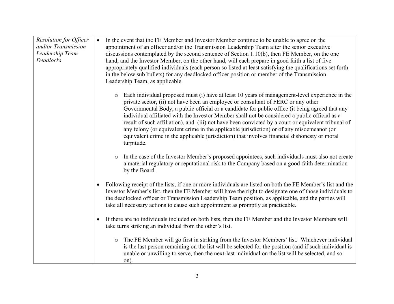 2 Resolution for Officer and/or Transmission Leadership Team Deadlocks • In the event that the FE Member and Investor Member continue to be unable to agree on the appointment of an officer and/or the Transmission Leadership Team after the senior executive discussions contemplated by the second sentence of Section 1.10(b), then FE Member, on the one hand, and the Investor Member, on the other hand, will each prepare in good faith a list of five appropriately qualified individuals (each person so listed at least satisfying the qualifications set forth in the below sub bullets) for any deadlocked officer position or member of the Transmission Leadership Team, as applicable. o Each individual proposed must (i) have at least 10 years of management-level experience in the private sector, (ii) not have been an employee or consultant of FERC or any other Governmental Body, a public official or a candidate for public office (it being agreed that any individual affiliated with the Investor Member shall not be considered a public official as a result of such affiliation), and (iii) not have been convicted by a court or equivalent tribunal of any felony (or equivalent crime in the applicable jurisdiction) or of any misdemeanor (or equivalent crime in the applicable jurisdiction) that involves financial dishonesty or moral turpitude. o In the case of the Investor Member’s proposed appointees, such individuals must also not create a material regulatory or reputational risk to the Company based on a good-faith determination by the Board. • Following receipt of the lists, if one or more individuals are listed on both the FE Member’s list and the Investor Member’s list, then the FE Member will have the right to designate one of those individuals to the deadlocked officer or Transmission Leadership Team position, as applicable, and the parties will take all necessary actions to cause such appointment as promptly as practicable. • If there are no individuals included on both lists, then the FE Member and the Investor Members will take turns striking an individual from the other’s list. o The FE Member will go first in striking from the Investor Members’ list. Whichever individual is the last person remaining on the list will be selected for the position (and if such individual is unable or unwilling to serve, then the next-last individual on the list will be selected, and so on).