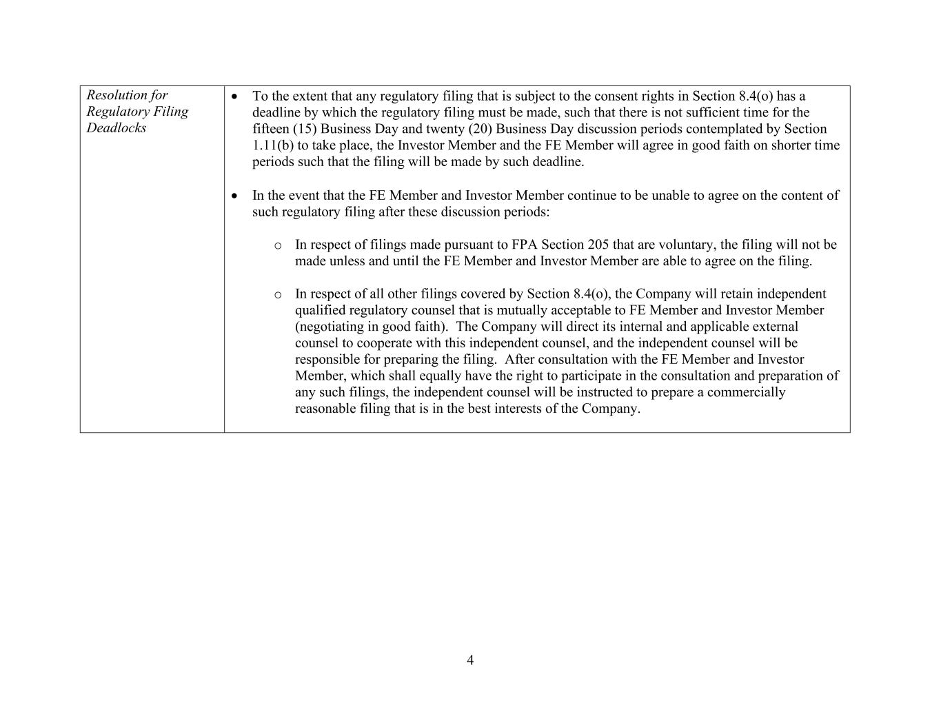 4 Resolution for Regulatory Filing Deadlocks • To the extent that any regulatory filing that is subject to the consent rights in Section 8.4(o) has a deadline by which the regulatory filing must be made, such that there is not sufficient time for the fifteen (15) Business Day and twenty (20) Business Day discussion periods contemplated by Section 1.11(b) to take place, the Investor Member and the FE Member will agree in good faith on shorter time periods such that the filing will be made by such deadline. • In the event that the FE Member and Investor Member continue to be unable to agree on the content of such regulatory filing after these discussion periods: o In respect of filings made pursuant to FPA Section 205 that are voluntary, the filing will not be made unless and until the FE Member and Investor Member are able to agree on the filing. o In respect of all other filings covered by Section 8.4(o), the Company will retain independent qualified regulatory counsel that is mutually acceptable to FE Member and Investor Member (negotiating in good faith). The Company will direct its internal and applicable external counsel to cooperate with this independent counsel, and the independent counsel will be responsible for preparing the filing. After consultation with the FE Member and Investor Member, which shall equally have the right to participate in the consultation and preparation of any such filings, the independent counsel will be instructed to prepare a commercially reasonable filing that is in the best interests of the Company.
