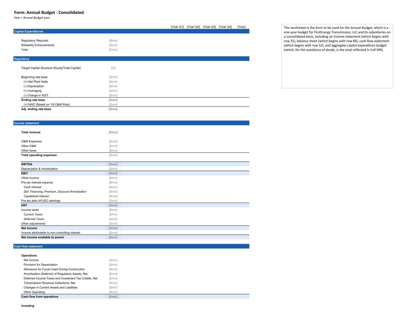 Form: Annual Budget - Consolidated Year = Annual Budget year [Year Q1] [Year Q2] [Year Q3] [Year Q4] [Year] Capital Expenditures Regulatory Required [$mm] Reliability Enhancements [$mm] Total [$mm] Regulatory Target Capital Structure (Equity/Total Capital) [%] Beginning rate base [$mm] (+) Net Plant Adds [$mm] (-) Depreciation [$mm] (+) Averaging [$mm] (-) Change in ADIT [$mm] Ending rate base [$mm] (+) NWC (Based on 1/8 O&M Rule) [$mm] Adj. ending rate base [$mm] Income statement Total revenue [$mm] O&M Expenses [$mm] Other O&M [$mm] Other taxes [$mm] Total operating expenses [$mm] EBITDA [$mm] Depreciation & Amortization [$mm] EBIT [$mm] Other income [$mm] Pre-tax interest expense [$mm] Cash Interest [$mm] Def. Financing, Premium, Discount Amortization [$mm] Capitalized interest [$mm] Pre-tax debt AFUDC earnings [$mm] EBT [$mm] Income taxes [$mm] Current Taxes [$mm] Deferred Taxes [$mm] Other adjustments [$mm] Net Income [$mm] Income attributable to non-controlling interest [$mm] Net income available to parent [$mm] Cash flow statement Operations Net income [$mm] Provision for Depreciation [$mm] Allowance for Funds Used During Construction [$mm] Amortization (Deferral) of Regulatory Assets, Net [$mm] Deferred Income Taxes and Investment Tax Credits, Net [$mm] Transmission Revenue Collections, Net [$mm] Changes in Current Assets and Liabilities [$mm] Other Operating [$mm] Cash flow from operations [$mm] Investing This worksheet is the form to be used for the Annual Budget, which is a one-year budget for FirstEnergy Transmission, LLC and its subsidiaries on a consolidated basis, including an income statement (which begins with row 25), balance sheet (which begins with row 84), cash flow statement (which begins with row 52), and aggregate capital expenditure budget (which, for the avoidance of doubt, is the total reflected in Cell M9).