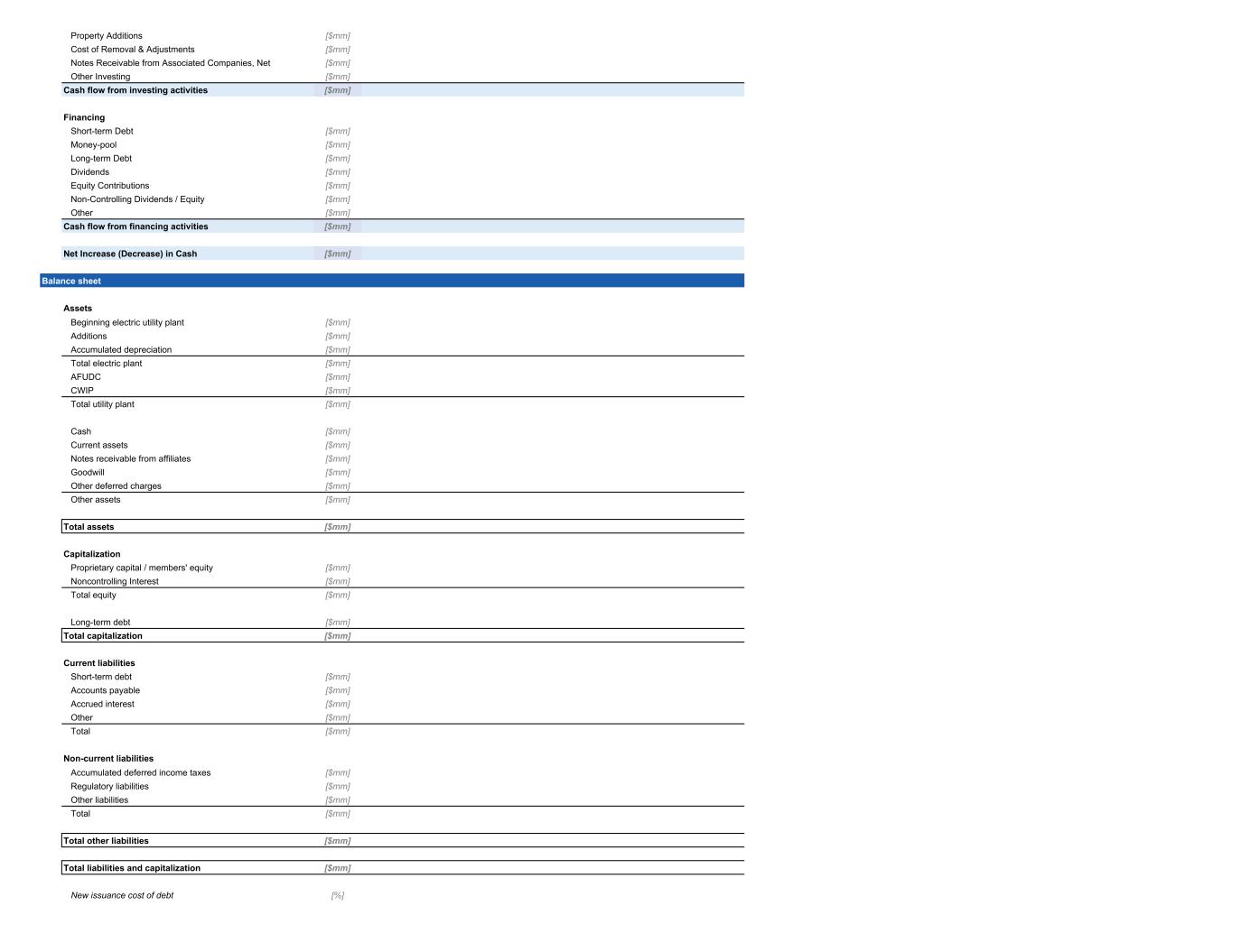 Property Additions [$mm] Cost of Removal & Adjustments [$mm] Notes Receivable from Associated Companies, Net [$mm] Other Investing [$mm] Cash flow from investing activities [$mm] Financing Short-term Debt [$mm] Money-pool [$mm] Long-term Debt [$mm] Dividends [$mm] Equity Contributions [$mm] Non-Controlling Dividends / Equity [$mm] Other [$mm] Cash flow from financing activities [$mm] Net Increase (Decrease) in Cash [$mm] Balance sheet Assets Beginning electric utility plant [$mm] Additions [$mm] Accumulated depreciation [$mm] Total electric plant [$mm] AFUDC [$mm] CWIP [$mm] Total utility plant [$mm] Cash [$mm] Current assets [$mm] Notes receivable from affiliates [$mm] Goodwill [$mm] Other deferred charges [$mm] Other assets [$mm] Total assets [$mm] Capitalization Proprietary capital / members' equity [$mm] Noncontrolling Interest [$mm] Total equity [$mm] Long-term debt [$mm] Total capitalization [$mm] Current liabilities Short-term debt [$mm] Accounts payable [$mm] Accrued interest [$mm] Other [$mm] Total [$mm] Non-current liabilities Accumulated deferred income taxes [$mm] Regulatory liabilities [$mm] Other liabilities [$mm] Total [$mm] Total other liabilities [$mm] Total liabilities and capitalization [$mm] New issuance cost of debt [%]