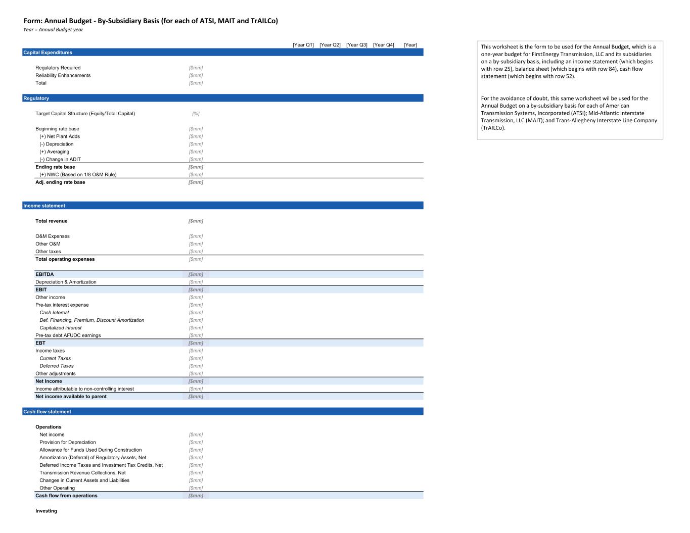 Form: Annual Budget - By-Subsidiary Basis (for each of ATSI, MAIT and TrAILCo) Year = Annual Budget year [Year Q1] [Year Q2] [Year Q3] [Year Q4] [Year] Capital Expenditures Regulatory Required [$mm] Reliability Enhancements [$mm] Total [$mm] Regulatory Target Capital Structure (Equity/Total Capital) [%] Beginning rate base [$mm] (+) Net Plant Adds [$mm] (-) Depreciation [$mm] (+) Averaging [$mm] (-) Change in ADIT [$mm] Ending rate base [$mm] (+) NWC (Based on 1/8 O&M Rule) [$mm] Adj. ending rate base [$mm] Income statement Total revenue [$mm] O&M Expenses [$mm] Other O&M [$mm] Other taxes [$mm] Total operating expenses [$mm] EBITDA [$mm] Depreciation & Amortization [$mm] EBIT [$mm] Other income [$mm] Pre-tax interest expense [$mm] Cash Interest [$mm] Def. Financing, Premium, Discount Amortization [$mm] Capitalized interest [$mm] Pre-tax debt AFUDC earnings [$mm] EBT [$mm] Income taxes [$mm] Current Taxes [$mm] Deferred Taxes [$mm] Other adjustments [$mm] Net Income [$mm] Income attributable to non-controlling interest [$mm] Net income available to parent [$mm] Cash flow statement Operations Net income [$mm] Provision for Depreciation [$mm] Allowance for Funds Used During Construction [$mm] Amortization (Deferral) of Regulatory Assets, Net [$mm] Deferred Income Taxes and Investment Tax Credits, Net [$mm] Transmission Revenue Collections, Net [$mm] Changes in Current Assets and Liabilities [$mm] Other Operating [$mm] Cash flow from operations [$mm] Investing This worksheet is the form to be used for the Annual Budget, which is a one-year budget for FirstEnergy Transmission, LLC and its subsidiaries on a by-subsidiary basis, including an income statement (which begins with row 25), balance sheet (which begins with row 84), cash flow statement (which begins with row 52). For the avoidance of doubt, this same worksheet wil be used for the Annual Budget on a by-subsidiary basis for each of American Transmission Systems, Incorporated (ATSI); Mid-Atlantic Interstate Transmission, LLC (MAIT); and Trans-Allegheny Interstate Line Company (TrAILCo).