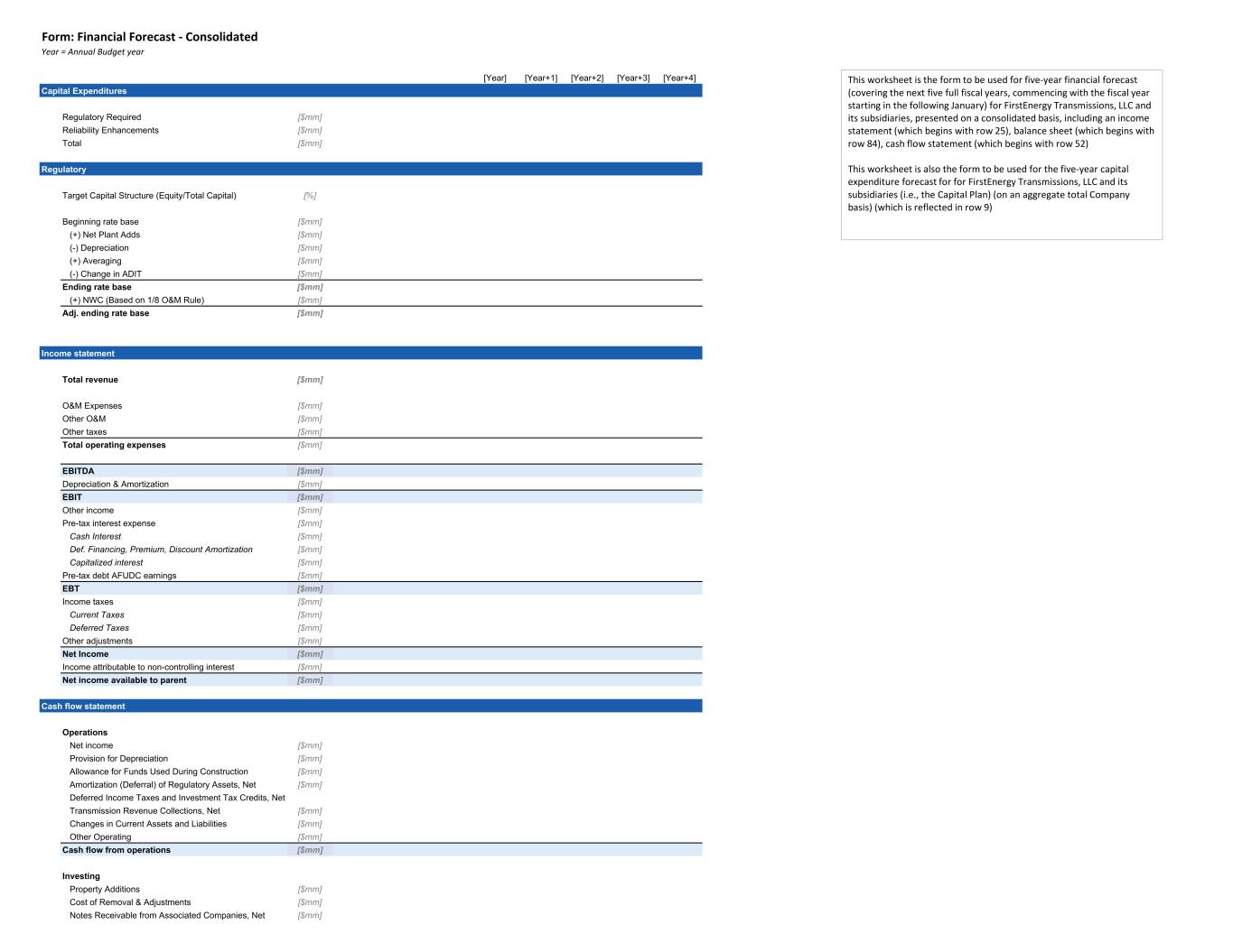 Form: Financial Forecast - Consolidated Year = Annual Budget year [Year] [Year+1] [Year+2] [Year+3] [Year+4] Capital Expenditures Regulatory Required [$mm] Reliability Enhancements [$mm] Total [$mm] Regulatory Target Capital Structure (Equity/Total Capital) [%] Beginning rate base [$mm] (+) Net Plant Adds [$mm] (-) Depreciation [$mm] (+) Averaging [$mm] (-) Change in ADIT [$mm] Ending rate base [$mm] (+) NWC (Based on 1/8 O&M Rule) [$mm] Adj. ending rate base [$mm] Income statement Total revenue [$mm] O&M Expenses [$mm] Other O&M [$mm] Other taxes [$mm] Total operating expenses [$mm] EBITDA [$mm] Depreciation & Amortization [$mm] EBIT [$mm] Other income [$mm] Pre-tax interest expense [$mm] Cash Interest [$mm] Def. Financing, Premium, Discount Amortization [$mm] Capitalized interest [$mm] Pre-tax debt AFUDC earnings [$mm] EBT [$mm] Income taxes [$mm] Current Taxes [$mm] Deferred Taxes [$mm] Other adjustments [$mm] Net Income [$mm] Income attributable to non-controlling interest [$mm] Net income available to parent [$mm] Cash flow statement Operations Net income [$mm] Provision for Depreciation [$mm] Allowance for Funds Used During Construction [$mm] Amortization (Deferral) of Regulatory Assets, Net [$mm] Deferred Income Taxes and Investment Tax Credits, Net Transmission Revenue Collections, Net [$mm] Changes in Current Assets and Liabilities [$mm] Other Operating [$mm] Cash flow from operations [$mm] Investing Property Additions [$mm] Cost of Removal & Adjustments [$mm] Notes Receivable from Associated Companies, Net [$mm] This worksheet is the form to be used for five-year financial forecast (covering the next five full fiscal years, commencing with the fiscal year starting in the following January) for FirstEnergy Transmissions, LLC and its subsidiaries, presented on a consolidated basis, including an income statement (which begins with row 25), balance sheet (which begins with row 84), cash flow statement (which begins with row 52) This worksheet is also the form to be used for the five-year capital expenditure forecast for for FirstEnergy Transmissions, LLC and its subsidiaries (i.e., the Capital Plan) (on an aggregate total Company basis) (which is reflected in row 9)