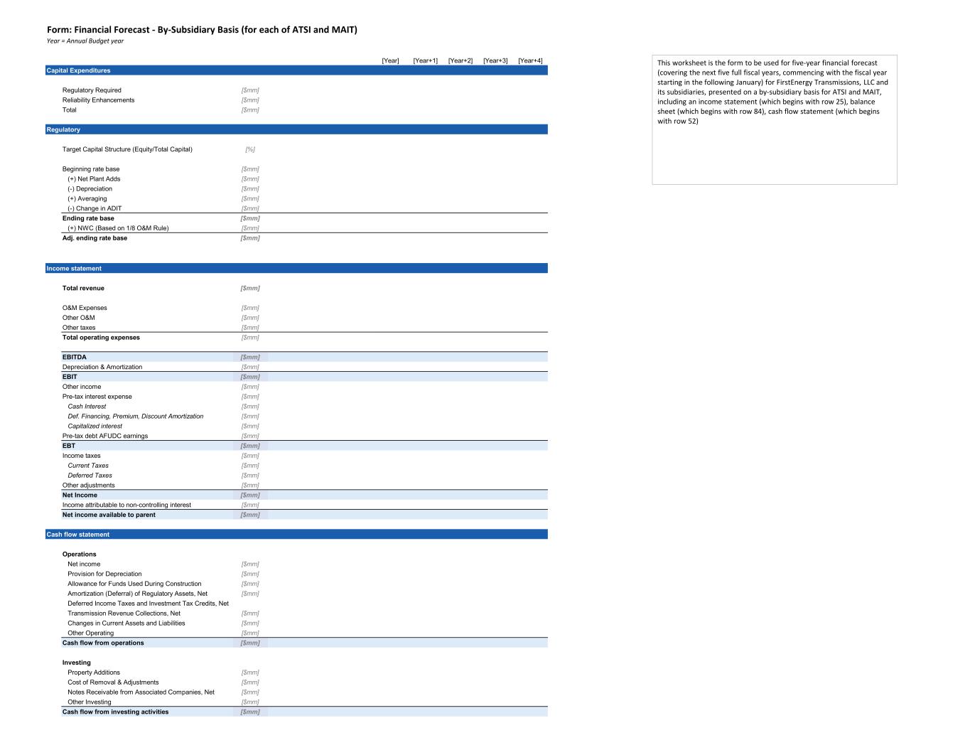 Form: Financial Forecast - By-Subsidiary Basis (for each of ATSI and MAIT) Year = Annual Budget year [Year] [Year+1] [Year+2] [Year+3] [Year+4] Capital Expenditures Regulatory Required [$mm] Reliability Enhancements [$mm] Total [$mm] Regulatory Target Capital Structure (Equity/Total Capital) [%] Beginning rate base [$mm] (+) Net Plant Adds [$mm] (-) Depreciation [$mm] (+) Averaging [$mm] (-) Change in ADIT [$mm] Ending rate base [$mm] (+) NWC (Based on 1/8 O&M Rule) [$mm] Adj. ending rate base [$mm] Income statement Total revenue [$mm] O&M Expenses [$mm] Other O&M [$mm] Other taxes [$mm] Total operating expenses [$mm] EBITDA [$mm] Depreciation & Amortization [$mm] EBIT [$mm] Other income [$mm] Pre-tax interest expense [$mm] Cash Interest [$mm] Def. Financing, Premium, Discount Amortization [$mm] Capitalized interest [$mm] Pre-tax debt AFUDC earnings [$mm] EBT [$mm] Income taxes [$mm] Current Taxes [$mm] Deferred Taxes [$mm] Other adjustments [$mm] Net Income [$mm] Income attributable to non-controlling interest [$mm] Net income available to parent [$mm] Cash flow statement Operations Net income [$mm] Provision for Depreciation [$mm] Allowance for Funds Used During Construction [$mm] Amortization (Deferral) of Regulatory Assets, Net [$mm] Deferred Income Taxes and Investment Tax Credits, Net Transmission Revenue Collections, Net [$mm] Changes in Current Assets and Liabilities [$mm] Other Operating [$mm] Cash flow from operations [$mm] Investing Property Additions [$mm] Cost of Removal & Adjustments [$mm] Notes Receivable from Associated Companies, Net [$mm] Other Investing [$mm] Cash flow from investing activities [$mm] This worksheet is the form to be used for five-year financial forecast (covering the next five full fiscal years, commencing with the fiscal year starting in the following January) for FirstEnergy Transmissions, LLC and its subsidiaries, presented on a by-subsidiary basis for ATSI and MAIT, including an income statement (which begins with row 25), balance sheet (which begins with row 84), cash flow statement (which begins with row 52)