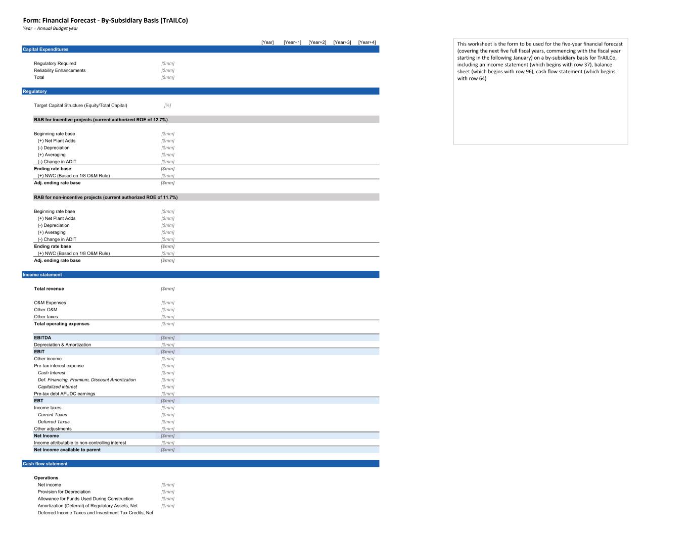 Form: Financial Forecast - By-Subsidiary Basis (TrAILCo) Year = Annual Budget year [Year] [Year+1] [Year+2] [Year+3] [Year+4] Capital Expenditures Regulatory Required [$mm] Reliability Enhancements [$mm] Total [$mm] Regulatory Target Capital Structure (Equity/Total Capital) [%] RAB for incentive projects (current authorized ROE of 12.7%) Beginning rate base [$mm] (+) Net Plant Adds [$mm] (-) Depreciation [$mm] (+) Averaging [$mm] (-) Change in ADIT [$mm] Ending rate base [$mm] (+) NWC (Based on 1/8 O&M Rule) [$mm] Adj. ending rate base [$mm] RAB for non-incentive projects (current authorized ROE of 11.7%) Beginning rate base [$mm] (+) Net Plant Adds [$mm] (-) Depreciation [$mm] (+) Averaging [$mm] (-) Change in ADIT [$mm] Ending rate base [$mm] (+) NWC (Based on 1/8 O&M Rule) [$mm] Adj. ending rate base [$mm] Income statement Total revenue [$mm] O&M Expenses [$mm] Other O&M [$mm] Other taxes [$mm] Total operating expenses [$mm] EBITDA [$mm] Depreciation & Amortization [$mm] EBIT [$mm] Other income [$mm] Pre-tax interest expense [$mm] Cash Interest [$mm] Def. Financing, Premium, Discount Amortization [$mm] Capitalized interest [$mm] Pre-tax debt AFUDC earnings [$mm] EBT [$mm] Income taxes [$mm] Current Taxes [$mm] Deferred Taxes [$mm] Other adjustments [$mm] Net Income [$mm] Income attributable to non-controlling interest [$mm] Net income available to parent [$mm] Cash flow statement Operations Net income [$mm] Provision for Depreciation [$mm] Allowance for Funds Used During Construction [$mm] Amortization (Deferral) of Regulatory Assets, Net [$mm] Deferred Income Taxes and Investment Tax Credits, Net This worksheet is the form to be used for the five-year financial forecast (covering the next five full fiscal years, commencing with the fiscal year starting in the following January) on a by-subsidiary basis for TrAILCo, including an income statement (which begins with row 37), balance sheet (which begins with row 96), cash flow statement (which begins with row 64)