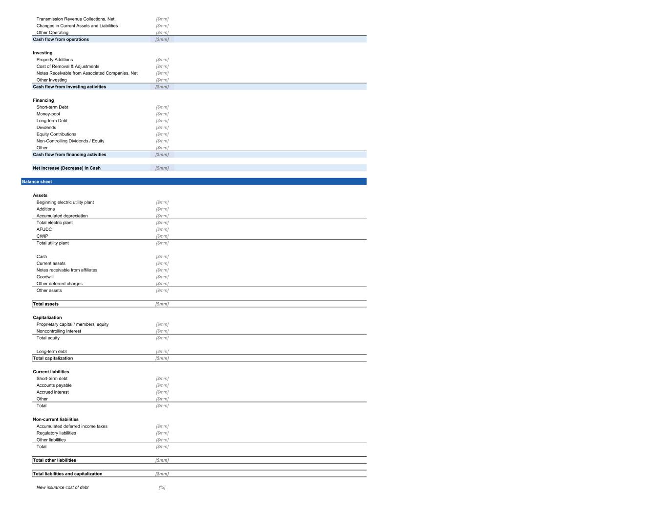 Transmission Revenue Collections, Net [$mm] Changes in Current Assets and Liabilities [$mm] Other Operating [$mm] Cash flow from operations [$mm] Investing Property Additions [$mm] Cost of Removal & Adjustments [$mm] Notes Receivable from Associated Companies, Net [$mm] Other Investing [$mm] Cash flow from investing activities [$mm] Financing Short-term Debt [$mm] Money-pool [$mm] Long-term Debt [$mm] Dividends [$mm] Equity Contributions [$mm] Non-Controlling Dividends / Equity [$mm] Other [$mm] Cash flow from financing activities [$mm] Net Increase (Decrease) in Cash [$mm] Balance sheet Assets Beginning electric utility plant [$mm] Additions [$mm] Accumulated depreciation [$mm] Total electric plant [$mm] AFUDC [$mm] CWIP [$mm] Total utility plant [$mm] Cash [$mm] Current assets [$mm] Notes receivable from affiliates [$mm] Goodwill [$mm] Other deferred charges [$mm] Other assets [$mm] Total assets [$mm] Capitalization Proprietary capital / members' equity [$mm] Noncontrolling Interest [$mm] Total equity [$mm] Long-term debt [$mm] Total capitalization [$mm] Current liabilities Short-term debt [$mm] Accounts payable [$mm] Accrued interest [$mm] Other [$mm] Total [$mm] Non-current liabilities Accumulated deferred income taxes [$mm] Regulatory liabilities [$mm] Other liabilities [$mm] Total [$mm] Total other liabilities [$mm] Total liabilities and capitalization [$mm] New issuance cost of debt [%]