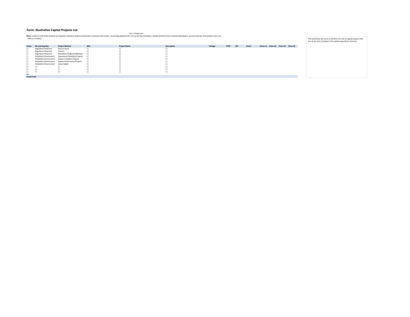 Form: Illustrative Capital Projects List Year = Budget year Note: credits & small dollar projects are typically related to projects previously in-serviced and include: accounting adjustments, true up during unitization, reimbursements from customer/developers, accrual reversals, final project costs, etc. Data as of [date] Entity Rel Enh Reg Req Project Method RPA Project Name Description Voltage RTEP ISD [Year] [Year+1] [Year+2] [Year+3] [Year+4] [ ] Regulatory Required Duty to Serve [ ] [ ] [ ] [ ] Regulatory Required Failures [ ] [ ] [ ] [ ] Regulatory Required Mandatory Programs/Blankets [ ] [ ] [ ] [ ] Reliability Enhancement Operational Flexibility Projects [ ] [ ] [ ] [ ] Reliability Enhancement System Condition Projects [ ] [ ] [ ] [ ] Reliability Enhancement System Performance Projects [ ] [ ] [ ] [ ] Reliability Enhancement Value Added [ ] [ ] [ ] [ ] [ ] [ ] [ ] [ ] [ ] [ ] [ ] [ ] [ ] [ ] [ ] [ ] [ ] [ ] [ ] [ ] [ ] etc. Grand Total This worksheet will serve as the form of a list of capital projects that are, at the time, included in the capital expenditure forecast.