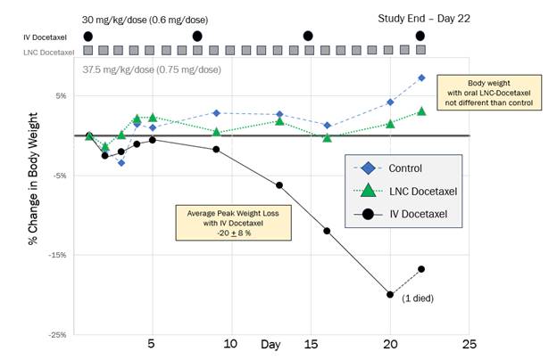 Daily oral LNC-docetaxel, at a total administered dose of more than 8x greater than IV-docetaxel, showed no evidence of weight loss, compared to an average peak weight loss of 20% with IV-docetaxel