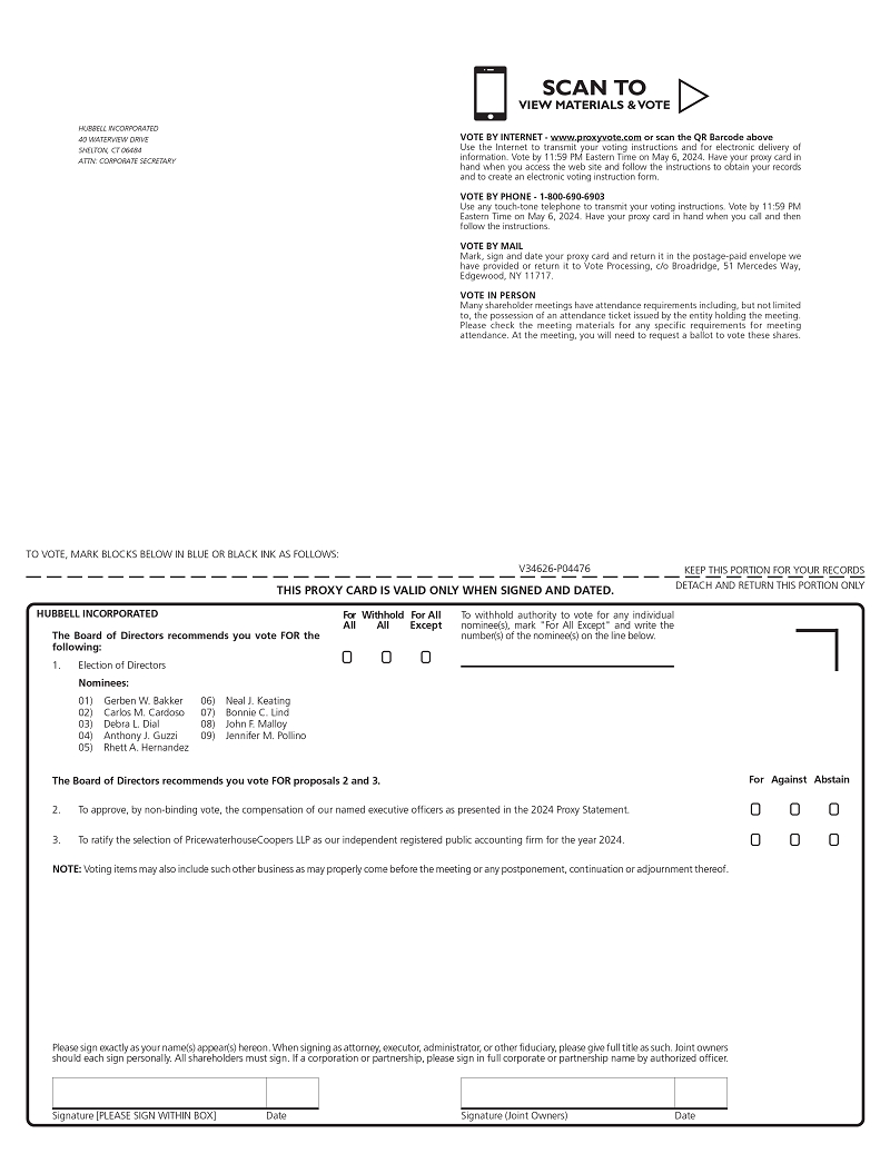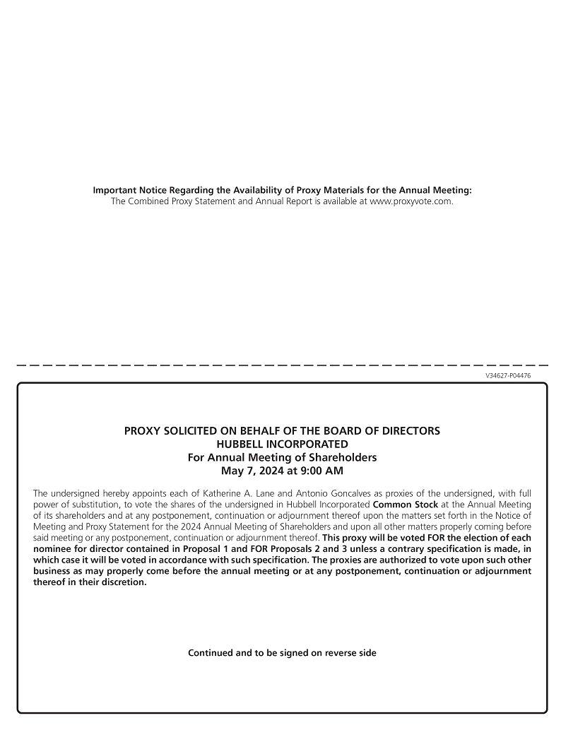 Your proxy is being solicited for the Annual Meeting of Shareholders (the “Annual Meeting”) of Hubbell Incorporated (“Hubbell” or the “Company”), or any adjournment, continuation, or postponement of the Annual Meeting, on behalf of Hubbell’s Board of Directors (the “Board”). Hubbell pays the cost of soliciting your proxy. On March 25, 2024, we mailed a Notice of the Internet Availability of Proxy Materials to all shareholders of record advising that they could view all of our proxy materials (Proxy Statement, proxy card and Annual Report on Form 10-K) online at www.proxyvote.com, or request a paper or email copy of the proxy materials, free of charge. We encourage you to access your proxy materials online to reduce the environmental impact and cost of our proxy solicitation. You may request a paper or email copy of the materials using any of the following methods: