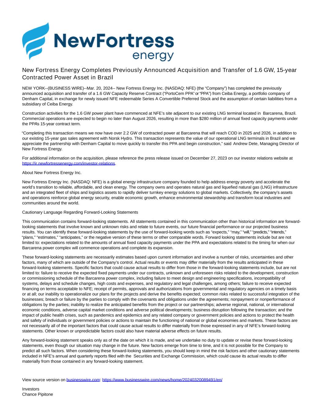 A-2 IN WITNESS WHEREOF, New Fortress Energy Inc. has caused this instrument to be duly executed as of the date set forth below. NEW FORTRESS ENERGY INC. Date: By: Name: Title: