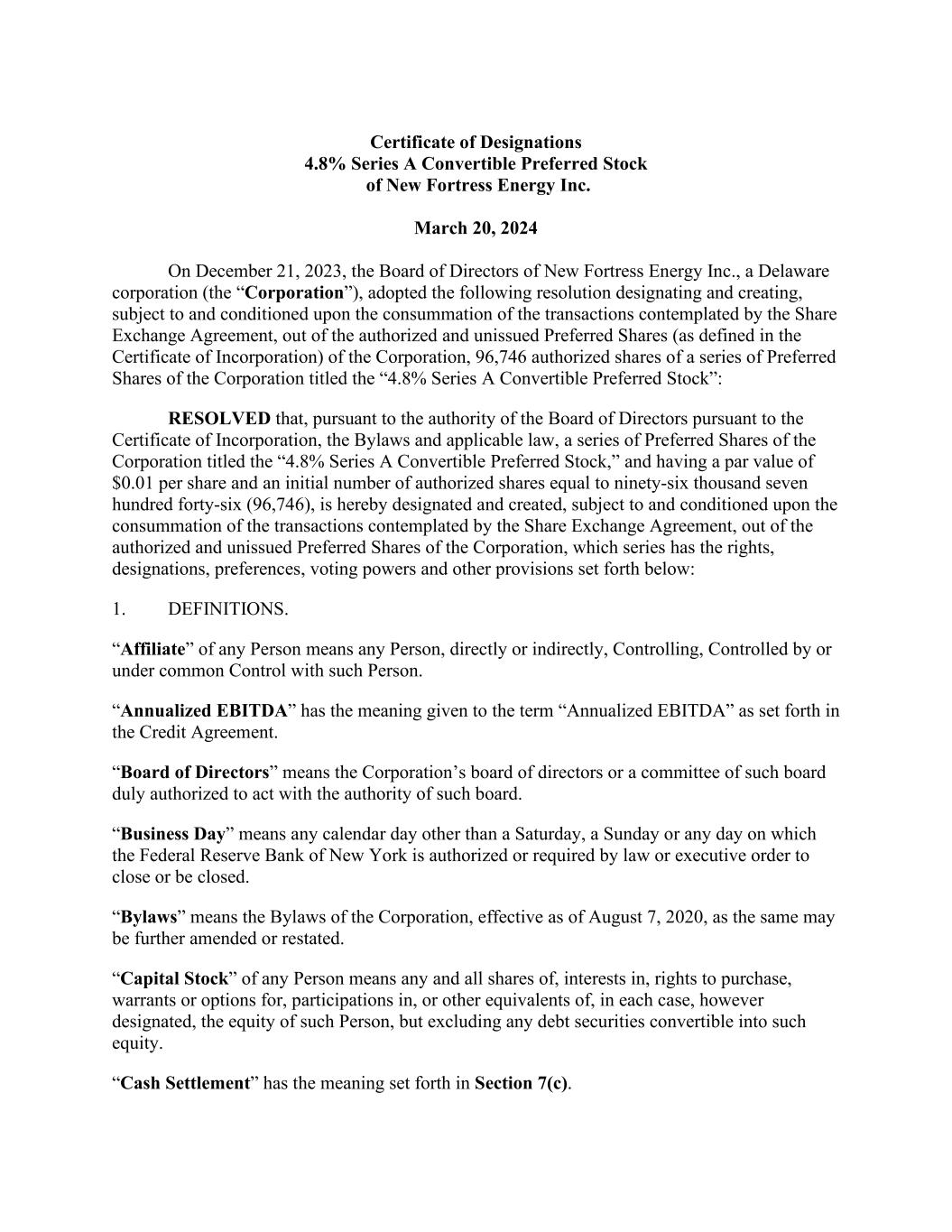 Certificate of Designations 4.8% Series A Convertible Preferred Stock of New Fortress Energy Inc. March 20, 2024 On December 21, 2023, the Board of Directors of New Fortress Energy Inc., a Delaware corporation (the “Corporation”), adopted the following resolution designating and creating, subject to and conditioned upon the consummation of the transactions contemplated by the Share Exchange Agreement, out of the authorized and unissued Preferred Shares (as defined in the Certificate of Incorporation) of the Corporation, 96,746 authorized shares of a series of Preferred Shares of the Corporation titled the “4.8% Series A Convertible Preferred Stock”: RESOLVED that, pursuant to the authority of the Board of Directors pursuant to the Certificate of Incorporation, the Bylaws and applicable law, a series of Preferred Shares of the Corporation titled the “4.8% Series A Convertible Preferred Stock,” and having a par value of $0.01 per share and an initial number of authorized shares equal to ninety-six thousand seven hundred forty-six (96,746), is hereby designated and created, subject to and conditioned upon the consummation of the transactions contemplated by the Share Exchange Agreement, out of the authorized and unissued Preferred Shares of the Corporation, which series has the rights, designations, preferences, voting powers and other provisions set forth below: 1. DEFINITIONS. “Affiliate” of any Person means any Person, directly or indirectly, Controlling, Controlled by or under common Control with such Person. “Annualized EBITDA” has the meaning given to the term “Annualized EBITDA” as set forth in the Credit Agreement. “Board of Directors” means the Corporation’s board of directors or a committee of such board duly authorized to act with the authority of such board. “Business Day” means any calendar day other than a Saturday, a Sunday or any day on which the Federal Reserve Bank of New York is authorized or required by law or executive order to close or be closed. “Bylaws” means the Bylaws of the Corporation, effective as of August 7, 2020, as the same may be further amended or restated. “Capital Stock” of any Person means any and all shares of, interests in, rights to purchase, warrants or options for, participations in, or other equivalents of, in each case, however designated, the equity of such Person, but excluding any debt securities convertible into such equity. “Cash Settlement” has the meaning set forth in Section 7(c).