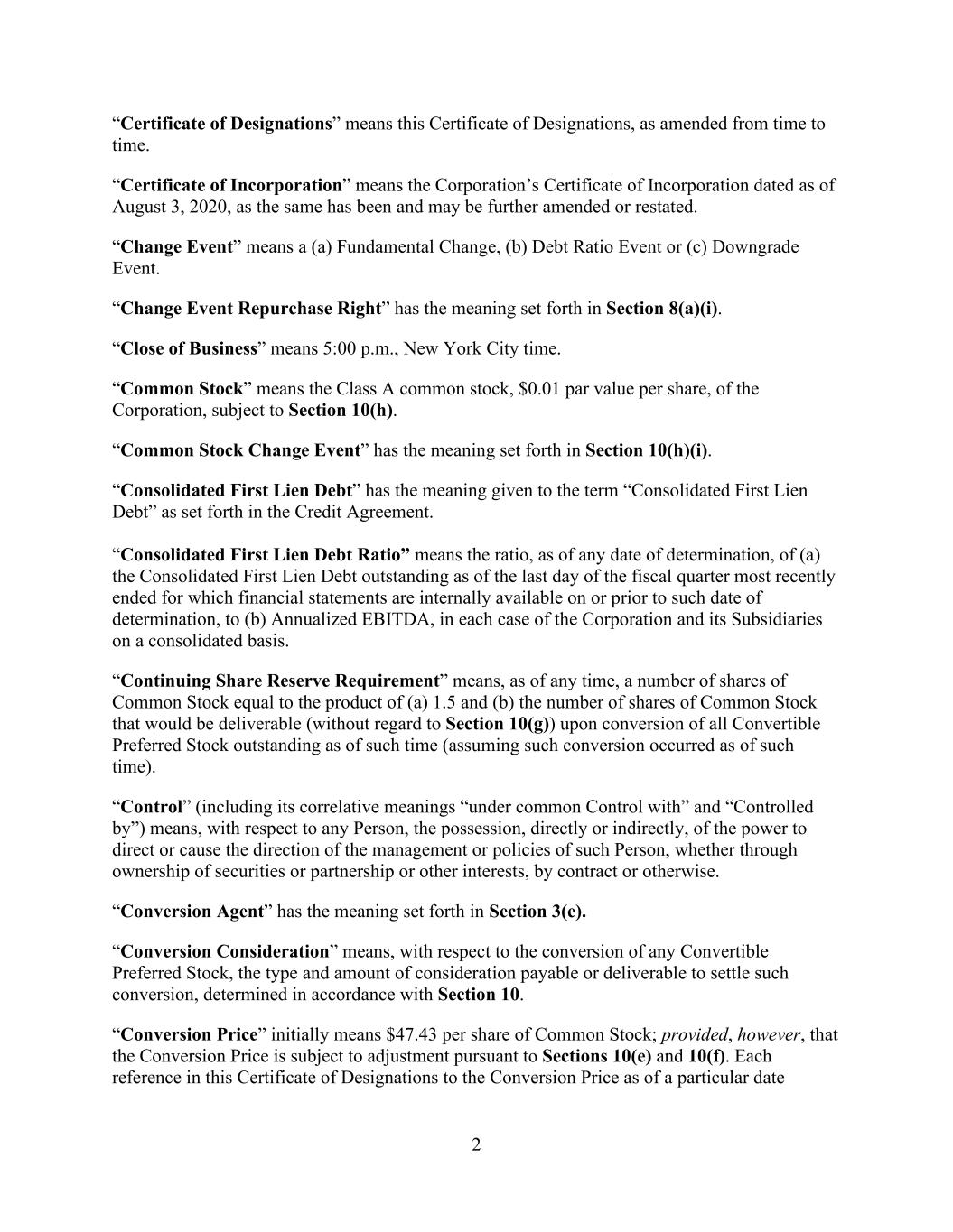 2 “Certificate of Designations” means this Certificate of Designations, as amended from time to time. “Certificate of Incorporation” means the Corporation’s Certificate of Incorporation dated as of August 3, 2020, as the same has been and may be further amended or restated. “Change Event” means a (a) Fundamental Change, (b) Debt Ratio Event or (c) Downgrade Event. “Change Event Repurchase Right” has the meaning set forth in Section 8(a)(i). “Close of Business” means 5:00 p.m., New York City time. “Common Stock” means the Class A common stock, $0.01 par value per share, of the Corporation, subject to Section 10(h). “Common Stock Change Event” has the meaning set forth in Section 10(h)(i). “Consolidated First Lien Debt” has the meaning given to the term “Consolidated First Lien Debt” as set forth in the Credit Agreement. “Consolidated First Lien Debt Ratio” means the ratio, as of any date of determination, of (a) the Consolidated First Lien Debt outstanding as of the last day of the fiscal quarter most recently ended for which financial statements are internally available on or prior to such date of determination, to (b) Annualized EBITDA, in each case of the Corporation and its Subsidiaries on a consolidated basis. “Continuing Share Reserve Requirement” means, as of any time, a number of shares of Common Stock equal to the product of (a) 1.5 and (b) the number of shares of Common Stock that would be deliverable (without regard to Section 10(g)) upon conversion of all Convertible Preferred Stock outstanding as of such time (assuming such conversion occurred as of such time). “Control” (including its correlative meanings “under common Control with” and “Controlled by”) means, with respect to any Person, the possession, directly or indirectly, of the power to direct or cause the direction of the management or policies of such Person, whether through ownership of securities or partnership or other interests, by contract or otherwise. “Conversion Agent” has the meaning set forth in Section 3(e). “Conversion Consideration” means, with respect to the conversion of any Convertible Preferred Stock, the type and amount of consideration payable or deliverable to settle such conversion, determined in accordance with Section 10. “Conversion Price” initially means $47.43 per share of Common Stock; provided, however, that the Conversion Price is subject to adjustment pursuant to Sections 10(e) and 10(f). Each reference in this Certificate of Designations to the Conversion Price as of a particular date