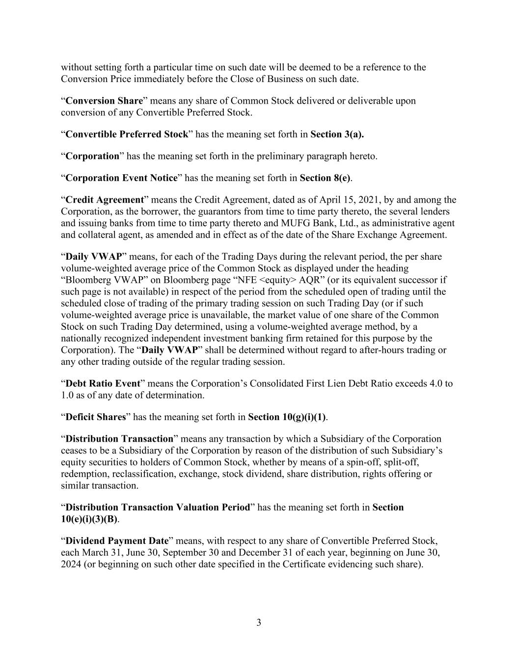 3 without setting forth a particular time on such date will be deemed to be a reference to the Conversion Price immediately before the Close of Business on such date. “Conversion Share” means any share of Common Stock delivered or deliverable upon conversion of any Convertible Preferred Stock. “Convertible Preferred Stock” has the meaning set forth in Section 3(a). “Corporation” has the meaning set forth in the preliminary paragraph hereto. “Corporation Event Notice” has the meaning set forth in Section 8(e). “Credit Agreement” means the Credit Agreement, dated as of April 15, 2021, by and among the Corporation, as the borrower, the guarantors from time to time party thereto, the several lenders and issuing banks from time to time party thereto and MUFG Bank, Ltd., as administrative agent and collateral agent, as amended and in effect as of the date of the Share Exchange Agreement. “Daily VWAP” means, for each of the Trading Days during the relevant period, the per share volume-weighted average price of the Common Stock as displayed under the heading “Bloomberg VWAP” on Bloomberg page “NFE <equity> AQR” (or its equivalent successor if such page is not available) in respect of the period from the scheduled open of trading until the scheduled close of trading of the primary trading session on such Trading Day (or if such volume-weighted average price is unavailable, the market value of one share of the Common Stock on such Trading Day determined, using a volume-weighted average method, by a nationally recognized independent investment banking firm retained for this purpose by the Corporation). The “Daily VWAP” shall be determined without regard to after-hours trading or any other trading outside of the regular trading session. “Debt Ratio Event” means the Corporation’s Consolidated First Lien Debt Ratio exceeds 4.0 to 1.0 as of any date of determination. “Deficit Shares” has the meaning set forth in Section 10(g)(i)(1). “Distribution Transaction” means any transaction by which a Subsidiary of the Corporation ceases to be a Subsidiary of the Corporation by reason of the distribution of such Subsidiary’s equity securities to holders of Common Stock, whether by means of a spin-off, split-off, redemption, reclassification, exchange, stock dividend, share distribution, rights offering or similar transaction. “Distribution Transaction Valuation Period” has the meaning set forth in Section 10(e)(i)(3)(B). “Dividend Payment Date” means, with respect to any share of Convertible Preferred Stock, each March 31, June 30, September 30 and December 31 of each year, beginning on June 30, 2024 (or beginning on such other date specified in the Certificate evidencing such share).