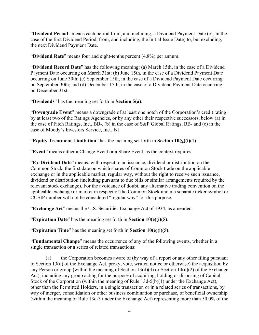 4 “Dividend Period” means each period from, and including, a Dividend Payment Date (or, in the case of the first Dividend Period, from, and including, the Initial Issue Date) to, but excluding, the next Dividend Payment Date. “Dividend Rate” means four and eight-tenths percent (4.8%) per annum. “Dividend Record Date” has the following meaning: (a) March 15th, in the case of a Dividend Payment Date occurring on March 31st; (b) June 15th, in the case of a Dividend Payment Date occurring on June 30th; (c) September 15th, in the case of a Dividend Payment Date occurring on September 30th; and (d) December 15th, in the case of a Dividend Payment Date occurring on December 31st. “Dividends” has the meaning set forth in Section 5(a). “Downgrade Event” means a downgrade of at least one notch of the Corporation’s credit rating by at least two of the Ratings Agencies, or by any other their respective successors, below (a) in the case of Fitch Ratings, Inc., BB-, (b) in the case of S&P Global Ratings, BB- and (c) in the case of Moody’s Investors Service, Inc., B1. “Equity Treatment Limitation” has the meaning set forth in Section 10(g)(i)(1). “Event” means either a Change Event or a Share Event, as the context requires. “Ex-Dividend Date” means, with respect to an issuance, dividend or distribution on the Common Stock, the first date on which shares of Common Stock trade on the applicable exchange or in the applicable market, regular way, without the right to receive such issuance, dividend or distribution (including pursuant to due bills or similar arrangements required by the relevant stock exchange). For the avoidance of doubt, any alternative trading convention on the applicable exchange or market in respect of the Common Stock under a separate ticker symbol or CUSIP number will not be considered “regular way” for this purpose. “Exchange Act” means the U.S. Securities Exchange Act of 1934, as amended. “Expiration Date” has the meaning set forth in Section 10(e)(i)(5). “Expiration Time” has the meaning set forth in Section 10(e)(i)(5). “Fundamental Change” means the occurrence of any of the following events, whether in a single transaction or a series of related transactions: (a) the Corporation becomes aware of (by way of a report or any other filing pursuant to Section 13(d) of the Exchange Act, proxy, vote, written notice or otherwise) the acquisition by any Person or group (within the meaning of Section 13(d)(3) or Section 14(d)(2) of the Exchange Act), including any group acting for the purpose of acquiring, holding or disposing of Capital Stock of the Corporation (within the meaning of Rule 13d-5(b)(1) under the Exchange Act), other than the Permitted Holders, in a single transaction or in a related series of transactions, by way of merger, consolidation or other business combination or purchase, of beneficial ownership (within the meaning of Rule 13d-3 under the Exchange Act) representing more than 50.0% of the