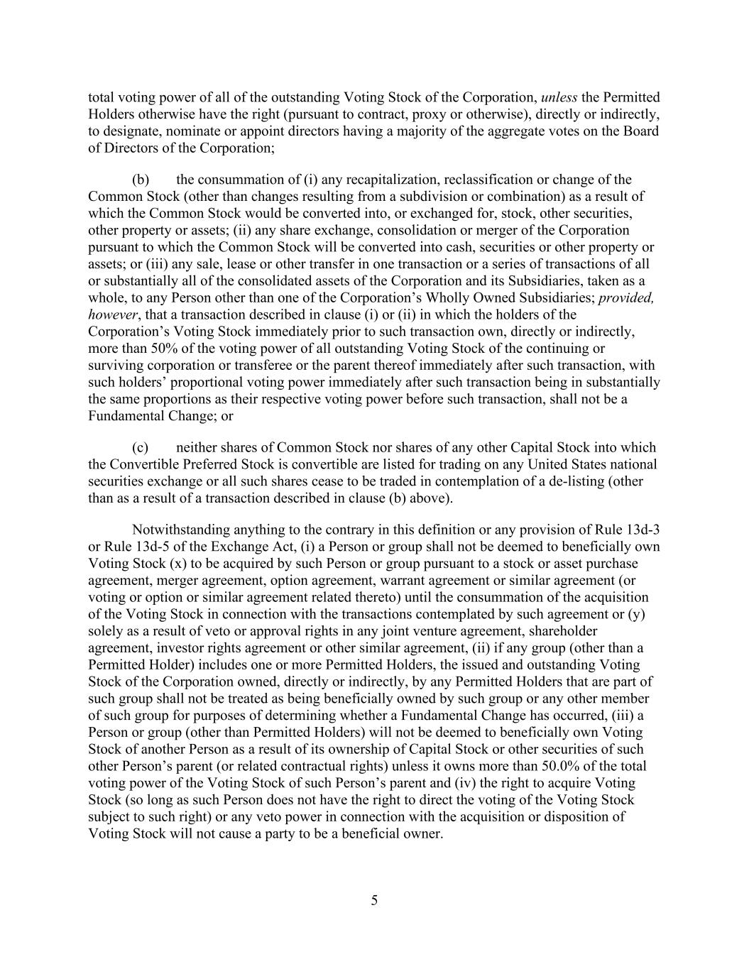 5 total voting power of all of the outstanding Voting Stock of the Corporation, unless the Permitted Holders otherwise have the right (pursuant to contract, proxy or otherwise), directly or indirectly, to designate, nominate or appoint directors having a majority of the aggregate votes on the Board of Directors of the Corporation; (b) the consummation of (i) any recapitalization, reclassification or change of the Common Stock (other than changes resulting from a subdivision or combination) as a result of which the Common Stock would be converted into, or exchanged for, stock, other securities, other property or assets; (ii) any share exchange, consolidation or merger of the Corporation pursuant to which the Common Stock will be converted into cash, securities or other property or assets; or (iii) any sale, lease or other transfer in one transaction or a series of transactions of all or substantially all of the consolidated assets of the Corporation and its Subsidiaries, taken as a whole, to any Person other than one of the Corporation’s Wholly Owned Subsidiaries; provided, however, that a transaction described in clause (i) or (ii) in which the holders of the Corporation’s Voting Stock immediately prior to such transaction own, directly or indirectly, more than 50% of the voting power of all outstanding Voting Stock of the continuing or surviving corporation or transferee or the parent thereof immediately after such transaction, with such holders’ proportional voting power immediately after such transaction being in substantially the same proportions as their respective voting power before such transaction, shall not be a Fundamental Change; or (c) neither shares of Common Stock nor shares of any other Capital Stock into which the Convertible Preferred Stock is convertible are listed for trading on any United States national securities exchange or all such shares cease to be traded in contemplation of a de-listing (other than as a result of a transaction described in clause (b) above). Notwithstanding anything to the contrary in this definition or any provision of Rule 13d-3 or Rule 13d-5 of the Exchange Act, (i) a Person or group shall not be deemed to beneficially own Voting Stock (x) to be acquired by such Person or group pursuant to a stock or asset purchase agreement, merger agreement, option agreement, warrant agreement or similar agreement (or voting or option or similar agreement related thereto) until the consummation of the acquisition of the Voting Stock in connection with the transactions contemplated by such agreement or (y) solely as a result of veto or approval rights in any joint venture agreement, shareholder agreement, investor rights agreement or other similar agreement, (ii) if any group (other than a Permitted Holder) includes one or more Permitted Holders, the issued and outstanding Voting Stock of the Corporation owned, directly or indirectly, by any Permitted Holders that are part of such group shall not be treated as being beneficially owned by such group or any other member of such group for purposes of determining whether a Fundamental Change has occurred, (iii) a Person or group (other than Permitted Holders) will not be deemed to beneficially own Voting Stock of another Person as a result of its ownership of Capital Stock or other securities of such other Person’s parent (or related contractual rights) unless it owns more than 50.0% of the total voting power of the Voting Stock of such Person’s parent and (iv) the right to acquire Voting Stock (so long as such Person does not have the right to direct the voting of the Voting Stock subject to such right) or any veto power in connection with the acquisition or disposition of Voting Stock will not cause a party to be a beneficial owner.