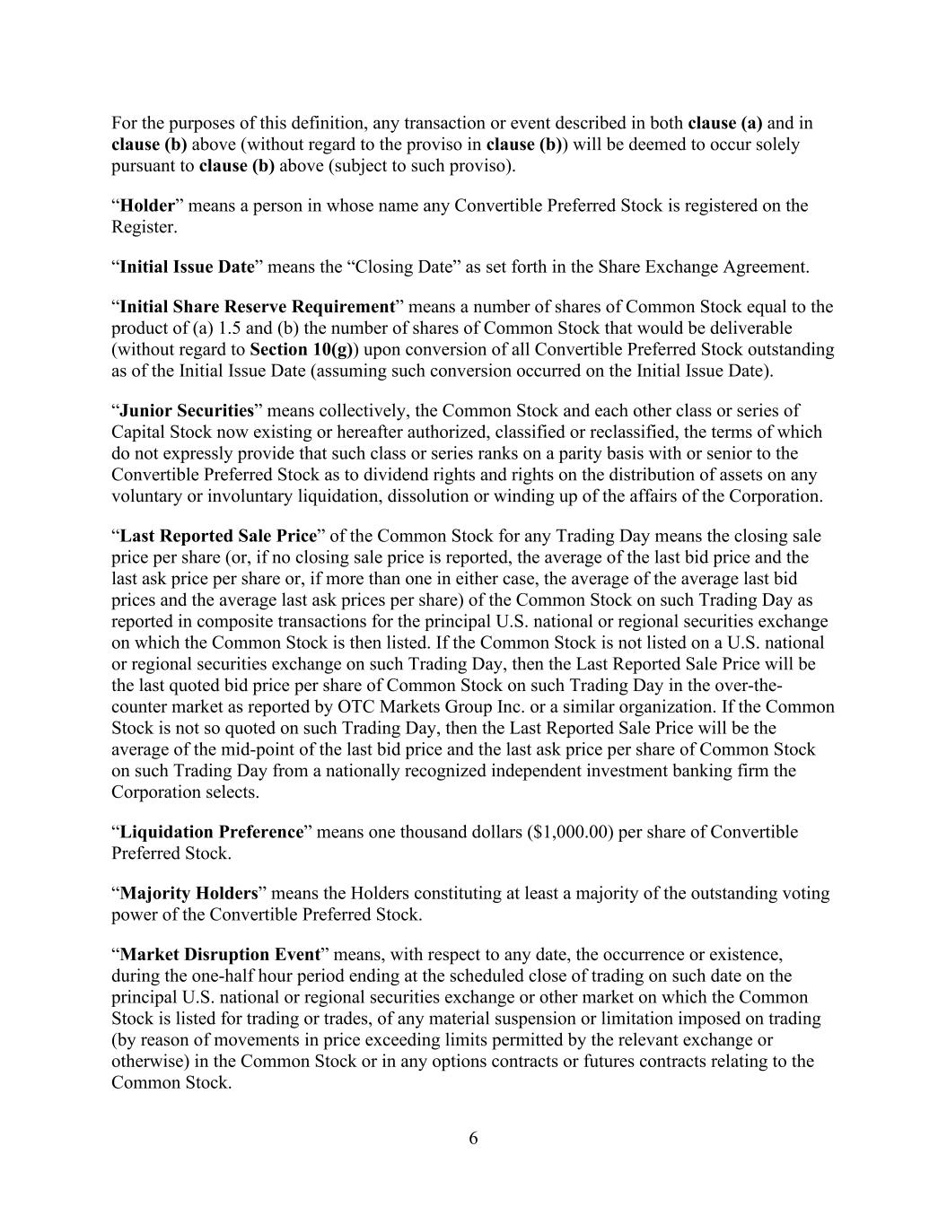6 For the purposes of this definition, any transaction or event described in both clause (a) and in clause (b) above (without regard to the proviso in clause (b)) will be deemed to occur solely pursuant to clause (b) above (subject to such proviso). “Holder” means a person in whose name any Convertible Preferred Stock is registered on the Register. “Initial Issue Date” means the “Closing Date” as set forth in the Share Exchange Agreement. “Initial Share Reserve Requirement” means a number of shares of Common Stock equal to the product of (a) 1.5 and (b) the number of shares of Common Stock that would be deliverable (without regard to Section 10(g)) upon conversion of all Convertible Preferred Stock outstanding as of the Initial Issue Date (assuming such conversion occurred on the Initial Issue Date). “Junior Securities” means collectively, the Common Stock and each other class or series of Capital Stock now existing or hereafter authorized, classified or reclassified, the terms of which do not expressly provide that such class or series ranks on a parity basis with or senior to the Convertible Preferred Stock as to dividend rights and rights on the distribution of assets on any voluntary or involuntary liquidation, dissolution or winding up of the affairs of the Corporation. “Last Reported Sale Price” of the Common Stock for any Trading Day means the closing sale price per share (or, if no closing sale price is reported, the average of the last bid price and the last ask price per share or, if more than one in either case, the average of the average last bid prices and the average last ask prices per share) of the Common Stock on such Trading Day as reported in composite transactions for the principal U.S. national or regional securities exchange on which the Common Stock is then listed. If the Common Stock is not listed on a U.S. national or regional securities exchange on such Trading Day, then the Last Reported Sale Price will be the last quoted bid price per share of Common Stock on such Trading Day in the over-the- counter market as reported by OTC Markets Group Inc. or a similar organization. If the Common Stock is not so quoted on such Trading Day, then the Last Reported Sale Price will be the average of the mid-point of the last bid price and the last ask price per share of Common Stock on such Trading Day from a nationally recognized independent investment banking firm the Corporation selects. “Liquidation Preference” means one thousand dollars ($1,000.00) per share of Convertible Preferred Stock. “Majority Holders” means the Holders constituting at least a majority of the outstanding voting power of the Convertible Preferred Stock. “Market Disruption Event” means, with respect to any date, the occurrence or existence, during the one-half hour period ending at the scheduled close of trading on such date on the principal U.S. national or regional securities exchange or other market on which the Common Stock is listed for trading or trades, of any material suspension or limitation imposed on trading (by reason of movements in price exceeding limits permitted by the relevant exchange or otherwise) in the Common Stock or in any options contracts or futures contracts relating to the Common Stock.