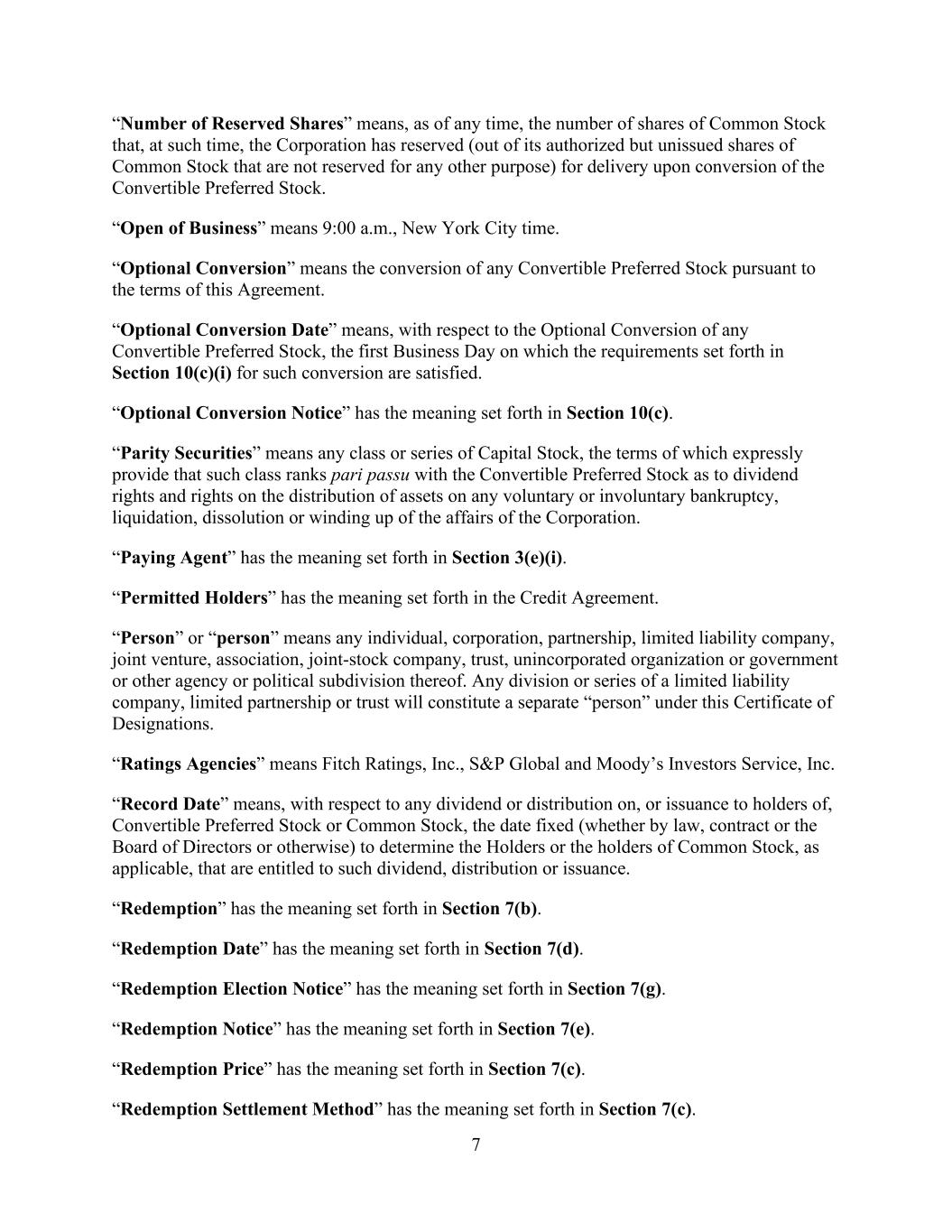 7 “Number of Reserved Shares” means, as of any time, the number of shares of Common Stock that, at such time, the Corporation has reserved (out of its authorized but unissued shares of Common Stock that are not reserved for any other purpose) for delivery upon conversion of the Convertible Preferred Stock. “Open of Business” means 9:00 a.m., New York City time. “Optional Conversion” means the conversion of any Convertible Preferred Stock pursuant to the terms of this Agreement. “Optional Conversion Date” means, with respect to the Optional Conversion of any Convertible Preferred Stock, the first Business Day on which the requirements set forth in Section 10(c)(i) for such conversion are satisfied. “Optional Conversion Notice” has the meaning set forth in Section 10(c). “Parity Securities” means any class or series of Capital Stock, the terms of which expressly provide that such class ranks pari passu with the Convertible Preferred Stock as to dividend rights and rights on the distribution of assets on any voluntary or involuntary bankruptcy, liquidation, dissolution or winding up of the affairs of the Corporation. “Paying Agent” has the meaning set forth in Section 3(e)(i). “Permitted Holders” has the meaning set forth in the Credit Agreement. “Person” or “person” means any individual, corporation, partnership, limited liability company, joint venture, association, joint-stock company, trust, unincorporated organization or government or other agency or political subdivision thereof. Any division or series of a limited liability company, limited partnership or trust will constitute a separate “person” under this Certificate of Designations. “Ratings Agencies” means Fitch Ratings, Inc., S&P Global and Moody’s Investors Service, Inc. “Record Date” means, with respect to any dividend or distribution on, or issuance to holders of, Convertible Preferred Stock or Common Stock, the date fixed (whether by law, contract or the Board of Directors or otherwise) to determine the Holders or the holders of Common Stock, as applicable, that are entitled to such dividend, distribution or issuance. “Redemption” has the meaning set forth in Section 7(b). “Redemption Date” has the meaning set forth in Section 7(d). “Redemption Election Notice” has the meaning set forth in Section 7(g). “Redemption Notice” has the meaning set forth in Section 7(e). “Redemption Price” has the meaning set forth in Section 7(c). “Redemption Settlement Method” has the meaning set forth in Section 7(c).