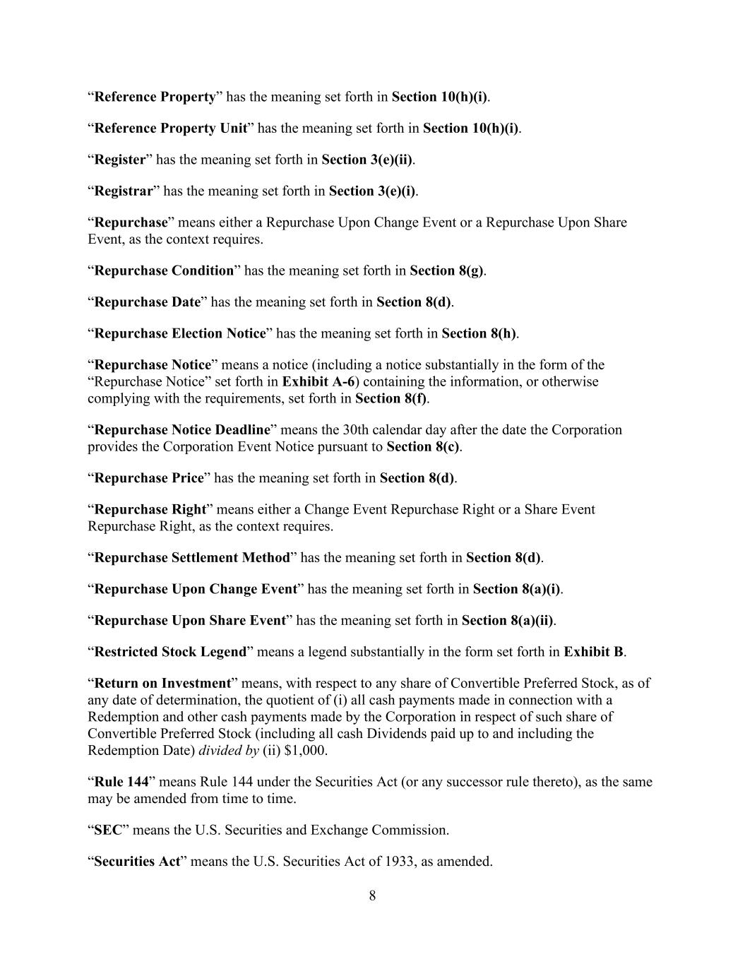 8 “Reference Property” has the meaning set forth in Section 10(h)(i). “Reference Property Unit” has the meaning set forth in Section 10(h)(i). “Register” has the meaning set forth in Section 3(e)(ii). “Registrar” has the meaning set forth in Section 3(e)(i). “Repurchase” means either a Repurchase Upon Change Event or a Repurchase Upon Share Event, as the context requires. “Repurchase Condition” has the meaning set forth in Section 8(g). “Repurchase Date” has the meaning set forth in Section 8(d). “Repurchase Election Notice” has the meaning set forth in Section 8(h). “Repurchase Notice” means a notice (including a notice substantially in the form of the “Repurchase Notice” set forth in Exhibit A-6) containing the information, or otherwise complying with the requirements, set forth in Section 8(f). “Repurchase Notice Deadline” means the 30th calendar day after the date the Corporation provides the Corporation Event Notice pursuant to Section 8(c). “Repurchase Price” has the meaning set forth in Section 8(d). “Repurchase Right” means either a Change Event Repurchase Right or a Share Event Repurchase Right, as the context requires. “Repurchase Settlement Method” has the meaning set forth in Section 8(d). “Repurchase Upon Change Event” has the meaning set forth in Section 8(a)(i). “Repurchase Upon Share Event” has the meaning set forth in Section 8(a)(ii). “Restricted Stock Legend” means a legend substantially in the form set forth in Exhibit B. “Return on Investment” means, with respect to any share of Convertible Preferred Stock, as of any date of determination, the quotient of (i) all cash payments made in connection with a Redemption and other cash payments made by the Corporation in respect of such share of Convertible Preferred Stock (including all cash Dividends paid up to and including the Redemption Date) divided by (ii) $1,000. “Rule 144” means Rule 144 under the Securities Act (or any successor rule thereto), as the same may be amended from time to time. “SEC” means the U.S. Securities and Exchange Commission. “Securities Act” means the U.S. Securities Act of 1933, as amended.