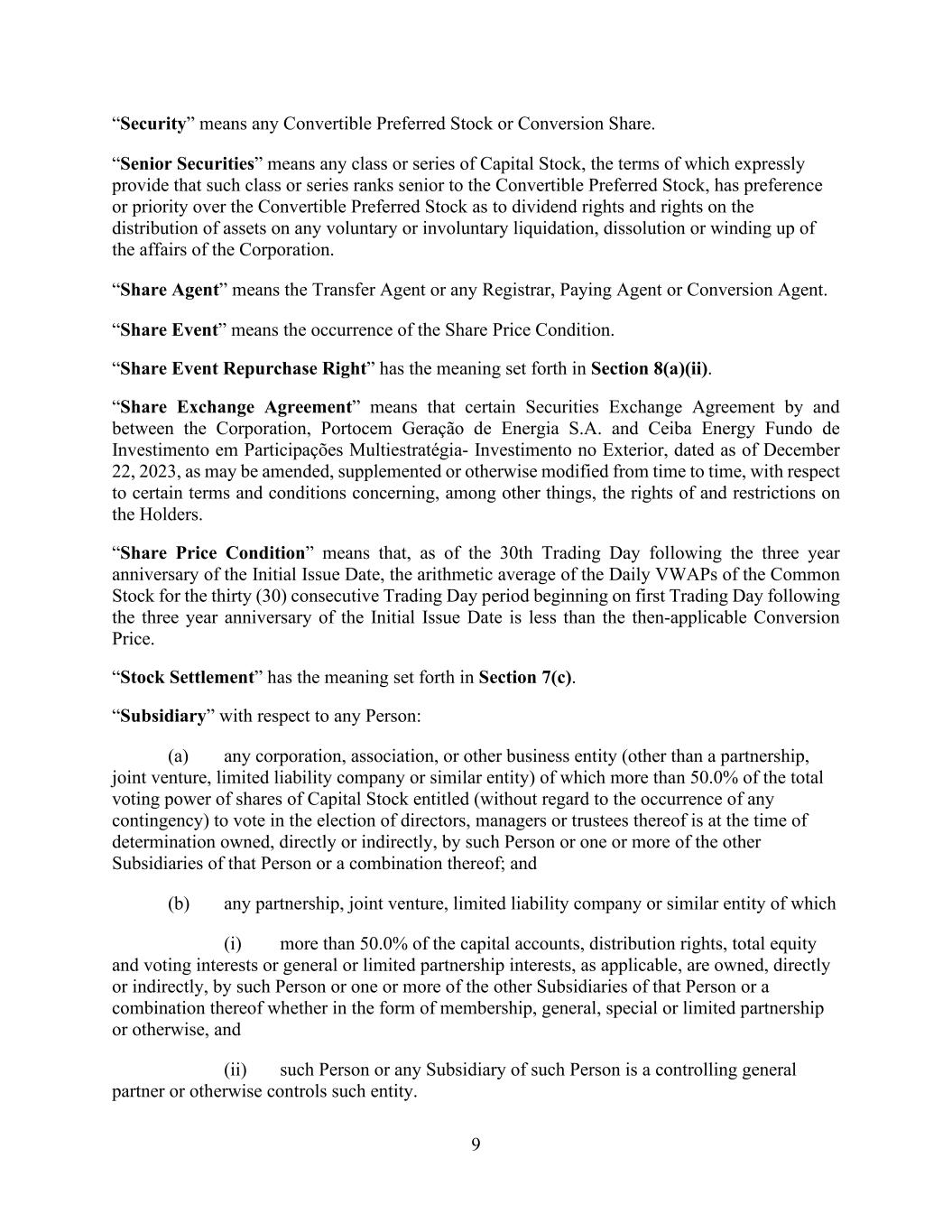 9 “Security” means any Convertible Preferred Stock or Conversion Share. “Senior Securities” means any class or series of Capital Stock, the terms of which expressly provide that such class or series ranks senior to the Convertible Preferred Stock, has preference or priority over the Convertible Preferred Stock as to dividend rights and rights on the distribution of assets on any voluntary or involuntary liquidation, dissolution or winding up of the affairs of the Corporation. “Share Agent” means the Transfer Agent or any Registrar, Paying Agent or Conversion Agent. “Share Event” means the occurrence of the Share Price Condition. “Share Event Repurchase Right” has the meaning set forth in Section 8(a)(ii). “Share Exchange Agreement” means that certain Securities Exchange Agreement by and between the Corporation, Portocem Geração de Energia S.A. and Ceiba Energy Fundo de Investimento em Participações Multiestratégia- Investimento no Exterior, dated as of December 22, 2023, as may be amended, supplemented or otherwise modified from time to time, with respect to certain terms and conditions concerning, among other things, the rights of and restrictions on the Holders. “Share Price Condition” means that, as of the 30th Trading Day following the three year anniversary of the Initial Issue Date, the arithmetic average of the Daily VWAPs of the Common Stock for the thirty (30) consecutive Trading Day period beginning on first Trading Day following the three year anniversary of the Initial Issue Date is less than the then-applicable Conversion Price. “Stock Settlement” has the meaning set forth in Section 7(c). “Subsidiary” with respect to any Person: (a) any corporation, association, or other business entity (other than a partnership, joint venture, limited liability company or similar entity) of which more than 50.0% of the total voting power of shares of Capital Stock entitled (without regard to the occurrence of any contingency) to vote in the election of directors, managers or trustees thereof is at the time of determination owned, directly or indirectly, by such Person or one or more of the other Subsidiaries of that Person or a combination thereof; and (b) any partnership, joint venture, limited liability company or similar entity of which (i) more than 50.0% of the capital accounts, distribution rights, total equity and voting interests or general or limited partnership interests, as applicable, are owned, directly or indirectly, by such Person or one or more of the other Subsidiaries of that Person or a combination thereof whether in the form of membership, general, special or limited partnership or otherwise, and (ii) such Person or any Subsidiary of such Person is a controlling general partner or otherwise controls such entity.