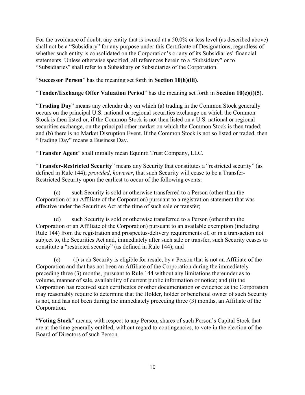 10 For the avoidance of doubt, any entity that is owned at a 50.0% or less level (as described above) shall not be a “Subsidiary” for any purpose under this Certificate of Designations, regardless of whether such entity is consolidated on the Corporation’s or any of its Subsidiaries’ financial statements. Unless otherwise specified, all references herein to a “Subsidiary” or to “Subsidiaries” shall refer to a Subsidiary or Subsidiaries of the Corporation. “Successor Person” has the meaning set forth in Section 10(h)(iii). “Tender/Exchange Offer Valuation Period” has the meaning set forth in Section 10(e)(i)(5). “Trading Day” means any calendar day on which (a) trading in the Common Stock generally occurs on the principal U.S. national or regional securities exchange on which the Common Stock is then listed or, if the Common Stock is not then listed on a U.S. national or regional securities exchange, on the principal other market on which the Common Stock is then traded; and (b) there is no Market Disruption Event. If the Common Stock is not so listed or traded, then “Trading Day” means a Business Day. “Transfer Agent” shall initially mean Equiniti Trust Company, LLC. “Transfer-Restricted Security” means any Security that constitutes a “restricted security” (as defined in Rule 144); provided, however, that such Security will cease to be a Transfer- Restricted Security upon the earliest to occur of the following events: (c) such Security is sold or otherwise transferred to a Person (other than the Corporation or an Affiliate of the Corporation) pursuant to a registration statement that was effective under the Securities Act at the time of such sale or transfer; (d) such Security is sold or otherwise transferred to a Person (other than the Corporation or an Affiliate of the Corporation) pursuant to an available exemption (including Rule 144) from the registration and prospectus-delivery requirements of, or in a transaction not subject to, the Securities Act and, immediately after such sale or transfer, such Security ceases to constitute a “restricted security” (as defined in Rule 144); and (e) (i) such Security is eligible for resale, by a Person that is not an Affiliate of the Corporation and that has not been an Affiliate of the Corporation during the immediately preceding three (3) months, pursuant to Rule 144 without any limitations thereunder as to volume, manner of sale, availability of current public information or notice; and (ii) the Corporation has received such certificates or other documentation or evidence as the Corporation may reasonably require to determine that the Holder, holder or beneficial owner of such Security is not, and has not been during the immediately preceding three (3) months, an Affiliate of the Corporation. “Voting Stock” means, with respect to any Person, shares of such Person’s Capital Stock that are at the time generally entitled, without regard to contingencies, to vote in the election of the Board of Directors of such Person.
