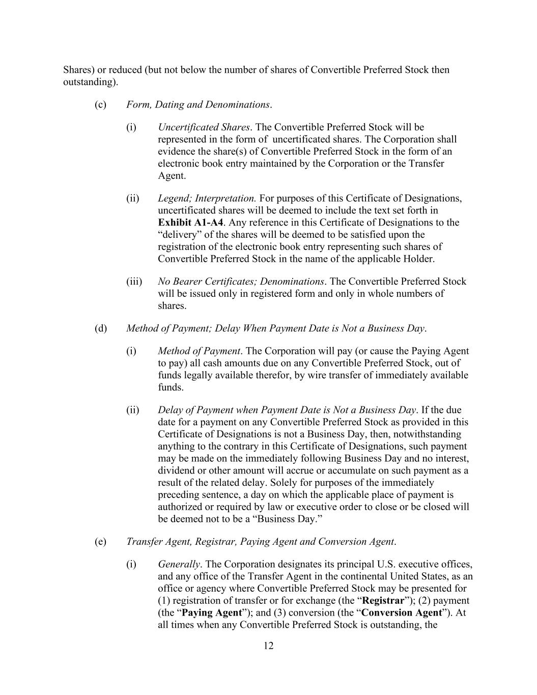 12 Shares) or reduced (but not below the number of shares of Convertible Preferred Stock then outstanding). (c) Form, Dating and Denominations. (i) Uncertificated Shares. The Convertible Preferred Stock will be represented in the form of uncertificated shares. The Corporation shall evidence the share(s) of Convertible Preferred Stock in the form of an electronic book entry maintained by the Corporation or the Transfer Agent. (ii) Legend; Interpretation. For purposes of this Certificate of Designations, uncertificated shares will be deemed to include the text set forth in Exhibit A1-A4. Any reference in this Certificate of Designations to the “delivery” of the shares will be deemed to be satisfied upon the registration of the electronic book entry representing such shares of Convertible Preferred Stock in the name of the applicable Holder. (iii) No Bearer Certificates; Denominations. The Convertible Preferred Stock will be issued only in registered form and only in whole numbers of shares. (d) Method of Payment; Delay When Payment Date is Not a Business Day. (i) Method of Payment. The Corporation will pay (or cause the Paying Agent to pay) all cash amounts due on any Convertible Preferred Stock, out of funds legally available therefor, by wire transfer of immediately available funds. (ii) Delay of Payment when Payment Date is Not a Business Day. If the due date for a payment on any Convertible Preferred Stock as provided in this Certificate of Designations is not a Business Day, then, notwithstanding anything to the contrary in this Certificate of Designations, such payment may be made on the immediately following Business Day and no interest, dividend or other amount will accrue or accumulate on such payment as a result of the related delay. Solely for purposes of the immediately preceding sentence, a day on which the applicable place of payment is authorized or required by law or executive order to close or be closed will be deemed not to be a “Business Day.” (e) Transfer Agent, Registrar, Paying Agent and Conversion Agent. (i) Generally. The Corporation designates its principal U.S. executive offices, and any office of the Transfer Agent in the continental United States, as an office or agency where Convertible Preferred Stock may be presented for (1) registration of transfer or for exchange (the “Registrar”); (2) payment (the “Paying Agent”); and (3) conversion (the “Conversion Agent”). At all times when any Convertible Preferred Stock is outstanding, the