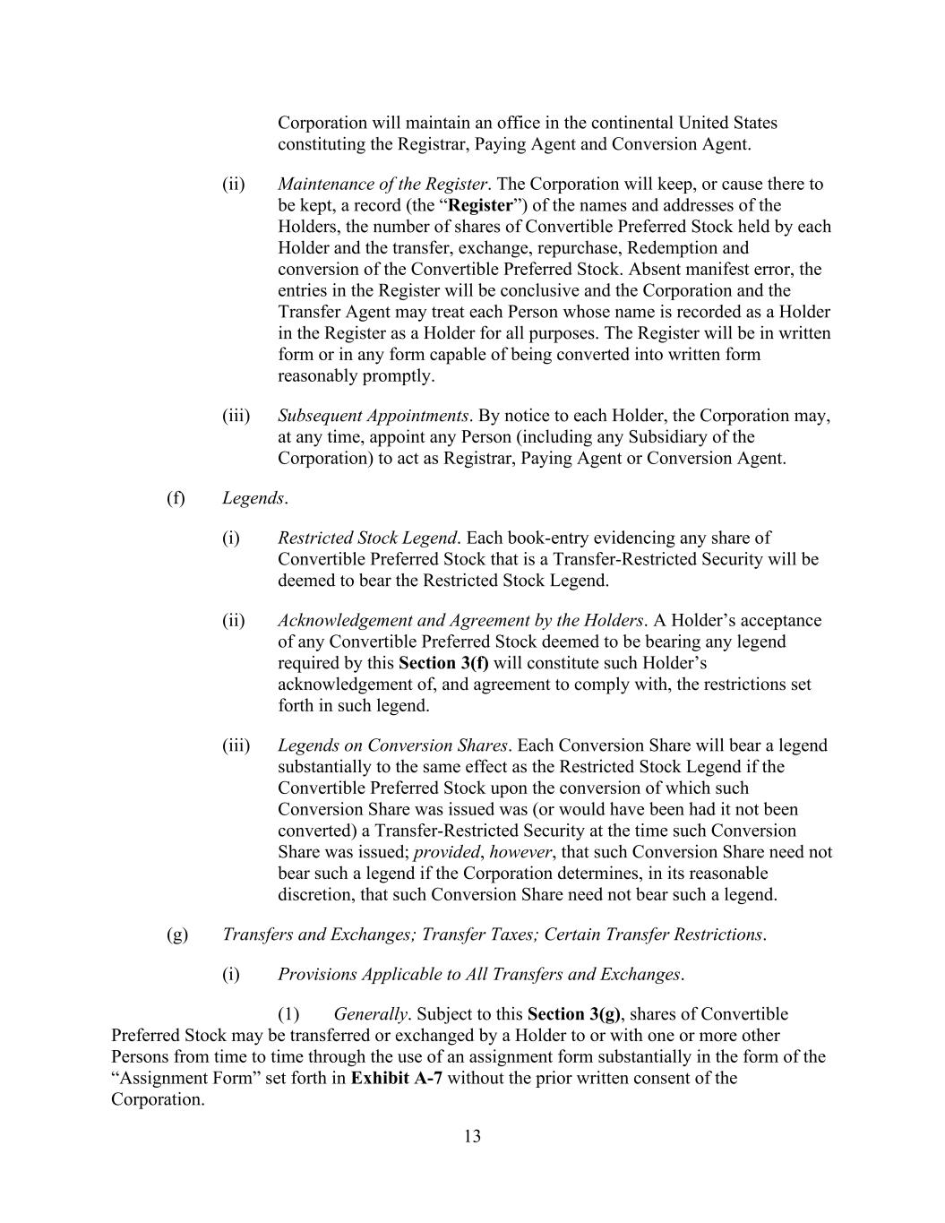 13 Corporation will maintain an office in the continental United States constituting the Registrar, Paying Agent and Conversion Agent. (ii) Maintenance of the Register. The Corporation will keep, or cause there to be kept, a record (the “Register”) of the names and addresses of the Holders, the number of shares of Convertible Preferred Stock held by each Holder and the transfer, exchange, repurchase, Redemption and conversion of the Convertible Preferred Stock. Absent manifest error, the entries in the Register will be conclusive and the Corporation and the Transfer Agent may treat each Person whose name is recorded as a Holder in the Register as a Holder for all purposes. The Register will be in written form or in any form capable of being converted into written form reasonably promptly. (iii) Subsequent Appointments. By notice to each Holder, the Corporation may, at any time, appoint any Person (including any Subsidiary of the Corporation) to act as Registrar, Paying Agent or Conversion Agent. (f) Legends. (i) Restricted Stock Legend. Each book-entry evidencing any share of Convertible Preferred Stock that is a Transfer-Restricted Security will be deemed to bear the Restricted Stock Legend. (ii) Acknowledgement and Agreement by the Holders. A Holder’s acceptance of any Convertible Preferred Stock deemed to be bearing any legend required by this Section 3(f) will constitute such Holder’s acknowledgement of, and agreement to comply with, the restrictions set forth in such legend. (iii) Legends on Conversion Shares. Each Conversion Share will bear a legend substantially to the same effect as the Restricted Stock Legend if the Convertible Preferred Stock upon the conversion of which such Conversion Share was issued was (or would have been had it not been converted) a Transfer-Restricted Security at the time such Conversion Share was issued; provided, however, that such Conversion Share need not bear such a legend if the Corporation determines, in its reasonable discretion, that such Conversion Share need not bear such a legend. (g) Transfers and Exchanges; Transfer Taxes; Certain Transfer Restrictions. (i) Provisions Applicable to All Transfers and Exchanges. (1) Generally. Subject to this Section 3(g), shares of Convertible Preferred Stock may be transferred or exchanged by a Holder to or with one or more other Persons from time to time through the use of an assignment form substantially in the form of the “Assignment Form” set forth in Exhibit A-7 without the prior written consent of the Corporation.