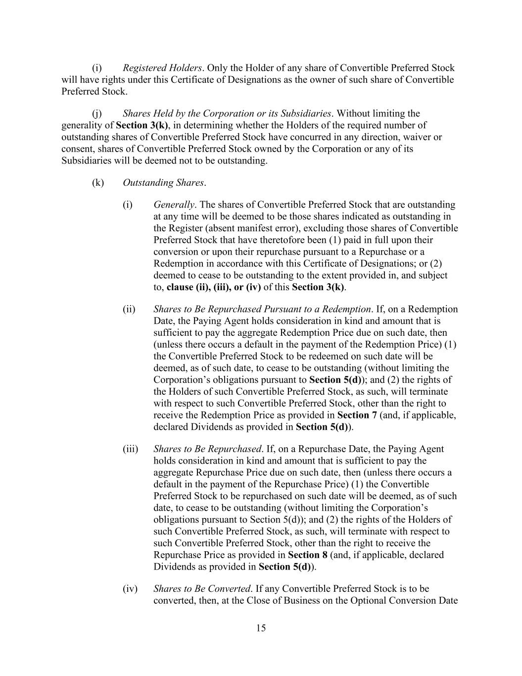 15 (i) Registered Holders. Only the Holder of any share of Convertible Preferred Stock will have rights under this Certificate of Designations as the owner of such share of Convertible Preferred Stock. (j) Shares Held by the Corporation or its Subsidiaries. Without limiting the generality of Section 3(k), in determining whether the Holders of the required number of outstanding shares of Convertible Preferred Stock have concurred in any direction, waiver or consent, shares of Convertible Preferred Stock owned by the Corporation or any of its Subsidiaries will be deemed not to be outstanding. (k) Outstanding Shares. (i) Generally. The shares of Convertible Preferred Stock that are outstanding at any time will be deemed to be those shares indicated as outstanding in the Register (absent manifest error), excluding those shares of Convertible Preferred Stock that have theretofore been (1) paid in full upon their conversion or upon their repurchase pursuant to a Repurchase or a Redemption in accordance with this Certificate of Designations; or (2) deemed to cease to be outstanding to the extent provided in, and subject to, clause (ii), (iii), or (iv) of this Section 3(k). (ii) Shares to Be Repurchased Pursuant to a Redemption. If, on a Redemption Date, the Paying Agent holds consideration in kind and amount that is sufficient to pay the aggregate Redemption Price due on such date, then (unless there occurs a default in the payment of the Redemption Price) (1) the Convertible Preferred Stock to be redeemed on such date will be deemed, as of such date, to cease to be outstanding (without limiting the Corporation’s obligations pursuant to Section 5(d)); and (2) the rights of the Holders of such Convertible Preferred Stock, as such, will terminate with respect to such Convertible Preferred Stock, other than the right to receive the Redemption Price as provided in Section 7 (and, if applicable, declared Dividends as provided in Section 5(d)). (iii) Shares to Be Repurchased. If, on a Repurchase Date, the Paying Agent holds consideration in kind and amount that is sufficient to pay the aggregate Repurchase Price due on such date, then (unless there occurs a default in the payment of the Repurchase Price) (1) the Convertible Preferred Stock to be repurchased on such date will be deemed, as of such date, to cease to be outstanding (without limiting the Corporation’s obligations pursuant to Section 5(d)); and (2) the rights of the Holders of such Convertible Preferred Stock, as such, will terminate with respect to such Convertible Preferred Stock, other than the right to receive the Repurchase Price as provided in Section 8 (and, if applicable, declared Dividends as provided in Section 5(d)). (iv) Shares to Be Converted. If any Convertible Preferred Stock is to be converted, then, at the Close of Business on the Optional Conversion Date