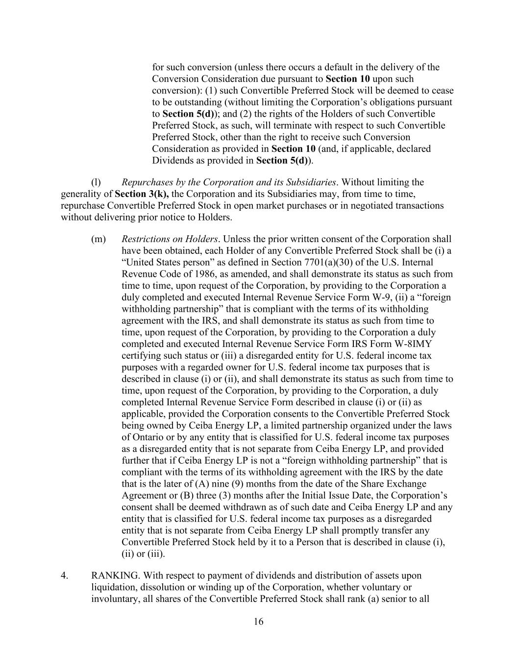 16 for such conversion (unless there occurs a default in the delivery of the Conversion Consideration due pursuant to Section 10 upon such conversion): (1) such Convertible Preferred Stock will be deemed to cease to be outstanding (without limiting the Corporation’s obligations pursuant to Section 5(d)); and (2) the rights of the Holders of such Convertible Preferred Stock, as such, will terminate with respect to such Convertible Preferred Stock, other than the right to receive such Conversion Consideration as provided in Section 10 (and, if applicable, declared Dividends as provided in Section 5(d)). (l) Repurchases by the Corporation and its Subsidiaries. Without limiting the generality of Section 3(k), the Corporation and its Subsidiaries may, from time to time, repurchase Convertible Preferred Stock in open market purchases or in negotiated transactions without delivering prior notice to Holders. (m) Restrictions on Holders. Unless the prior written consent of the Corporation shall have been obtained, each Holder of any Convertible Preferred Stock shall be (i) a “United States person” as defined in Section 7701(a)(30) of the U.S. Internal Revenue Code of 1986, as amended, and shall demonstrate its status as such from time to time, upon request of the Corporation, by providing to the Corporation a duly completed and executed Internal Revenue Service Form W-9, (ii) a “foreign withholding partnership” that is compliant with the terms of its withholding agreement with the IRS, and shall demonstrate its status as such from time to time, upon request of the Corporation, by providing to the Corporation a duly completed and executed Internal Revenue Service Form IRS Form W-8IMY certifying such status or (iii) a disregarded entity for U.S. federal income tax purposes with a regarded owner for U.S. federal income tax purposes that is described in clause (i) or (ii), and shall demonstrate its status as such from time to time, upon request of the Corporation, by providing to the Corporation, a duly completed Internal Revenue Service Form described in clause (i) or (ii) as applicable, provided the Corporation consents to the Convertible Preferred Stock being owned by Ceiba Energy LP, a limited partnership organized under the laws of Ontario or by any entity that is classified for U.S. federal income tax purposes as a disregarded entity that is not separate from Ceiba Energy LP, and provided further that if Ceiba Energy LP is not a “foreign withholding partnership” that is compliant with the terms of its withholding agreement with the IRS by the date that is the later of (A) nine (9) months from the date of the Share Exchange Agreement or (B) three (3) months after the Initial Issue Date, the Corporation’s consent shall be deemed withdrawn as of such date and Ceiba Energy LP and any entity that is classified for U.S. federal income tax purposes as a disregarded entity that is not separate from Ceiba Energy LP shall promptly transfer any Convertible Preferred Stock held by it to a Person that is described in clause (i), (ii) or (iii). 4. RANKING. With respect to payment of dividends and distribution of assets upon liquidation, dissolution or winding up of the Corporation, whether voluntary or involuntary, all shares of the Convertible Preferred Stock shall rank (a) senior to all