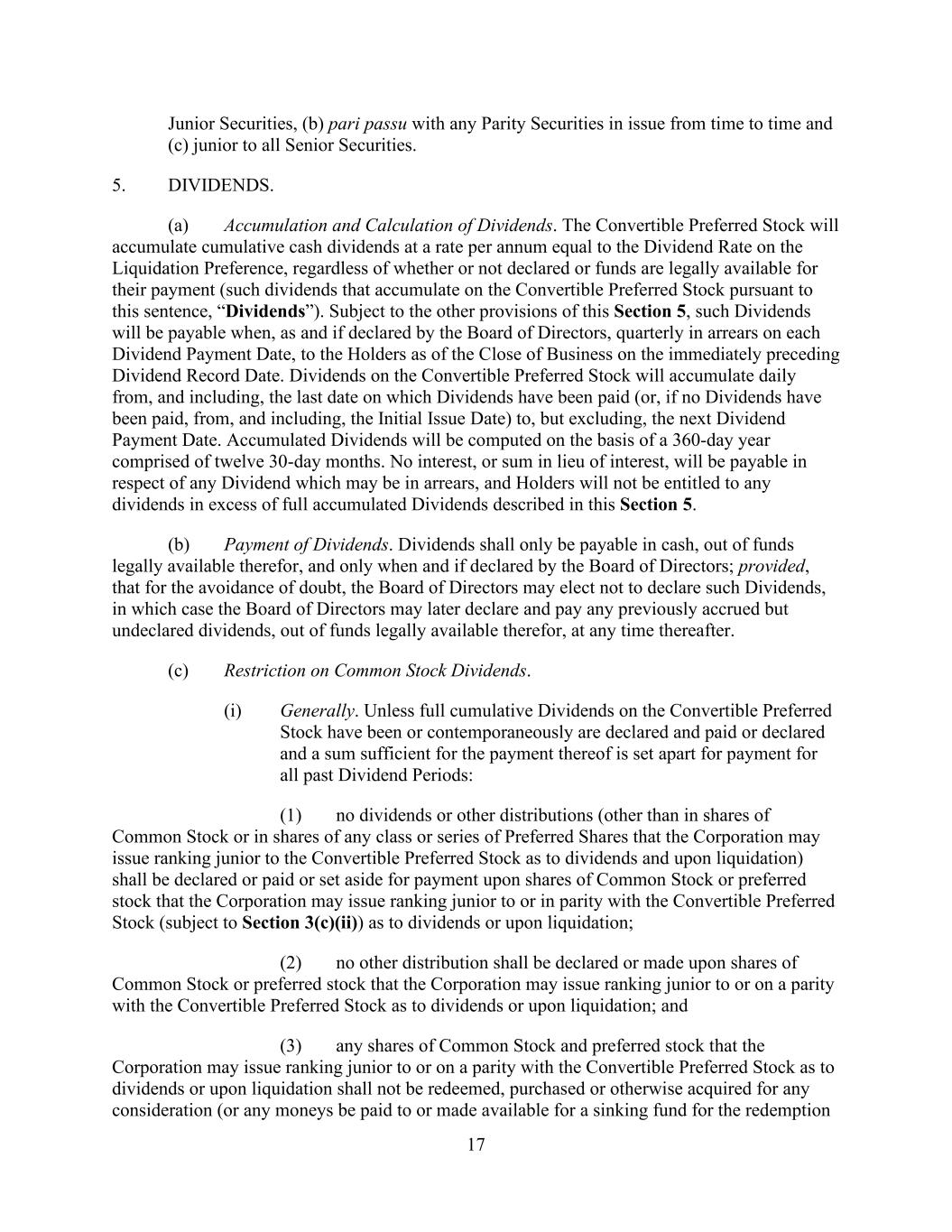 17 Junior Securities, (b) pari passu with any Parity Securities in issue from time to time and (c) junior to all Senior Securities. 5. DIVIDENDS. (a) Accumulation and Calculation of Dividends. The Convertible Preferred Stock will accumulate cumulative cash dividends at a rate per annum equal to the Dividend Rate on the Liquidation Preference, regardless of whether or not declared or funds are legally available for their payment (such dividends that accumulate on the Convertible Preferred Stock pursuant to this sentence, “Dividends”). Subject to the other provisions of this Section 5, such Dividends will be payable when, as and if declared by the Board of Directors, quarterly in arrears on each Dividend Payment Date, to the Holders as of the Close of Business on the immediately preceding Dividend Record Date. Dividends on the Convertible Preferred Stock will accumulate daily from, and including, the last date on which Dividends have been paid (or, if no Dividends have been paid, from, and including, the Initial Issue Date) to, but excluding, the next Dividend Payment Date. Accumulated Dividends will be computed on the basis of a 360-day year comprised of twelve 30-day months. No interest, or sum in lieu of interest, will be payable in respect of any Dividend which may be in arrears, and Holders will not be entitled to any dividends in excess of full accumulated Dividends described in this Section 5. (b) Payment of Dividends. Dividends shall only be payable in cash, out of funds legally available therefor, and only when and if declared by the Board of Directors; provided, that for the avoidance of doubt, the Board of Directors may elect not to declare such Dividends, in which case the Board of Directors may later declare and pay any previously accrued but undeclared dividends, out of funds legally available therefor, at any time thereafter. (c) Restriction on Common Stock Dividends. (i) Generally. Unless full cumulative Dividends on the Convertible Preferred Stock have been or contemporaneously are declared and paid or declared and a sum sufficient for the payment thereof is set apart for payment for all past Dividend Periods: (1) no dividends or other distributions (other than in shares of Common Stock or in shares of any class or series of Preferred Shares that the Corporation may issue ranking junior to the Convertible Preferred Stock as to dividends and upon liquidation) shall be declared or paid or set aside for payment upon shares of Common Stock or preferred stock that the Corporation may issue ranking junior to or in parity with the Convertible Preferred Stock (subject to Section 3(c)(ii)) as to dividends or upon liquidation; (2) no other distribution shall be declared or made upon shares of Common Stock or preferred stock that the Corporation may issue ranking junior to or on a parity with the Convertible Preferred Stock as to dividends or upon liquidation; and (3) any shares of Common Stock and preferred stock that the Corporation may issue ranking junior to or on a parity with the Convertible Preferred Stock as to dividends or upon liquidation shall not be redeemed, purchased or otherwise acquired for any consideration (or any moneys be paid to or made available for a sinking fund for the redemption