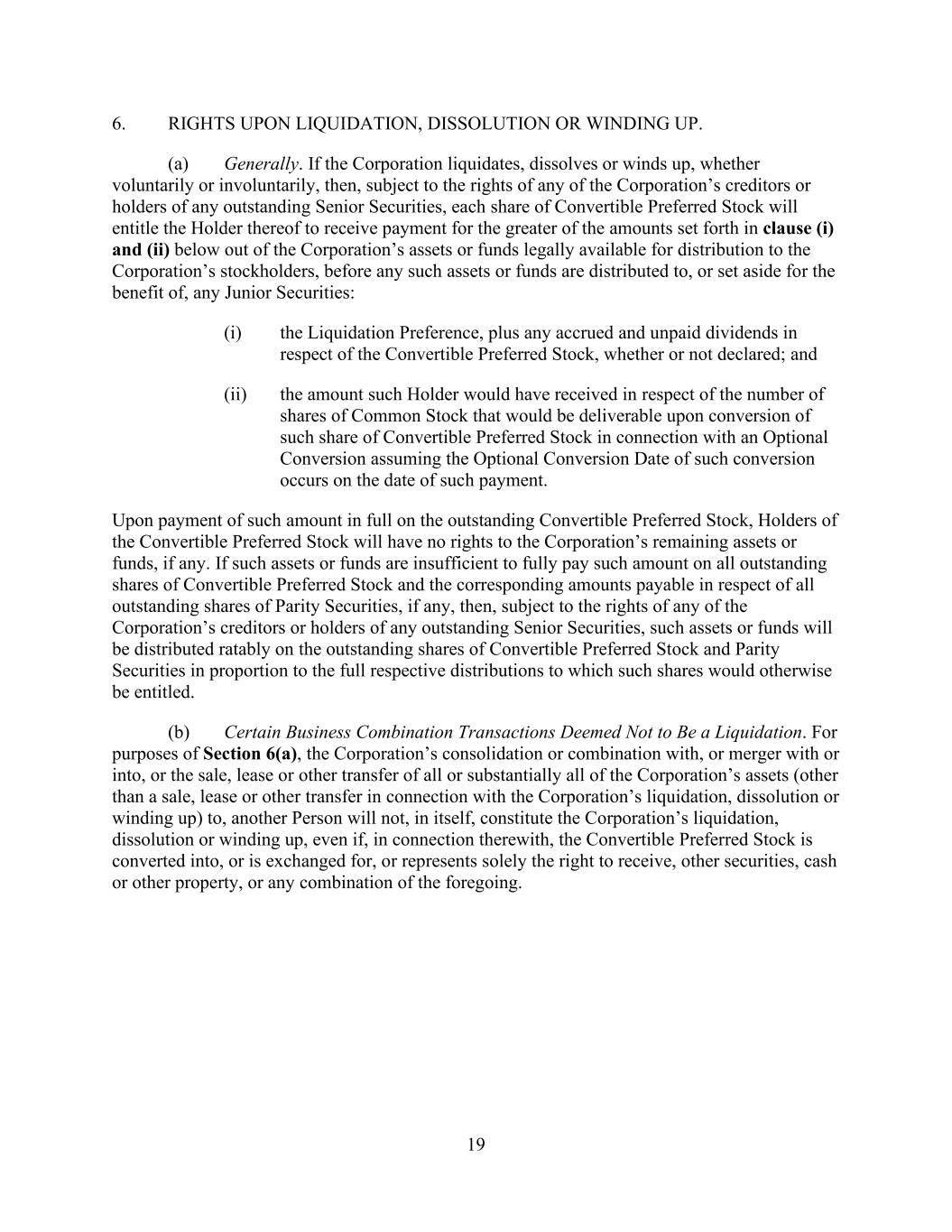 19 6. RIGHTS UPON LIQUIDATION, DISSOLUTION OR WINDING UP. (a) Generally. If the Corporation liquidates, dissolves or winds up, whether voluntarily or involuntarily, then, subject to the rights of any of the Corporation’s creditors or holders of any outstanding Senior Securities, each share of Convertible Preferred Stock will entitle the Holder thereof to receive payment for the greater of the amounts set forth in clause (i) and (ii) below out of the Corporation’s assets or funds legally available for distribution to the Corporation’s stockholders, before any such assets or funds are distributed to, or set aside for the benefit of, any Junior Securities: (i) the Liquidation Preference, plus any accrued and unpaid dividends in respect of the Convertible Preferred Stock, whether or not declared; and (ii) the amount such Holder would have received in respect of the number of shares of Common Stock that would be deliverable upon conversion of such share of Convertible Preferred Stock in connection with an Optional Conversion assuming the Optional Conversion Date of such conversion occurs on the date of such payment. Upon payment of such amount in full on the outstanding Convertible Preferred Stock, Holders of the Convertible Preferred Stock will have no rights to the Corporation’s remaining assets or funds, if any. If such assets or funds are insufficient to fully pay such amount on all outstanding shares of Convertible Preferred Stock and the corresponding amounts payable in respect of all outstanding shares of Parity Securities, if any, then, subject to the rights of any of the Corporation’s creditors or holders of any outstanding Senior Securities, such assets or funds will be distributed ratably on the outstanding shares of Convertible Preferred Stock and Parity Securities in proportion to the full respective distributions to which such shares would otherwise be entitled. (b) Certain Business Combination Transactions Deemed Not to Be a Liquidation. For purposes of Section 6(a), the Corporation’s consolidation or combination with, or merger with or into, or the sale, lease or other transfer of all or substantially all of the Corporation’s assets (other than a sale, lease or other transfer in connection with the Corporation’s liquidation, dissolution or winding up) to, another Person will not, in itself, constitute the Corporation’s liquidation, dissolution or winding up, even if, in connection therewith, the Convertible Preferred Stock is converted into, or is exchanged for, or represents solely the right to receive, other securities, cash or other property, or any combination of the foregoing.