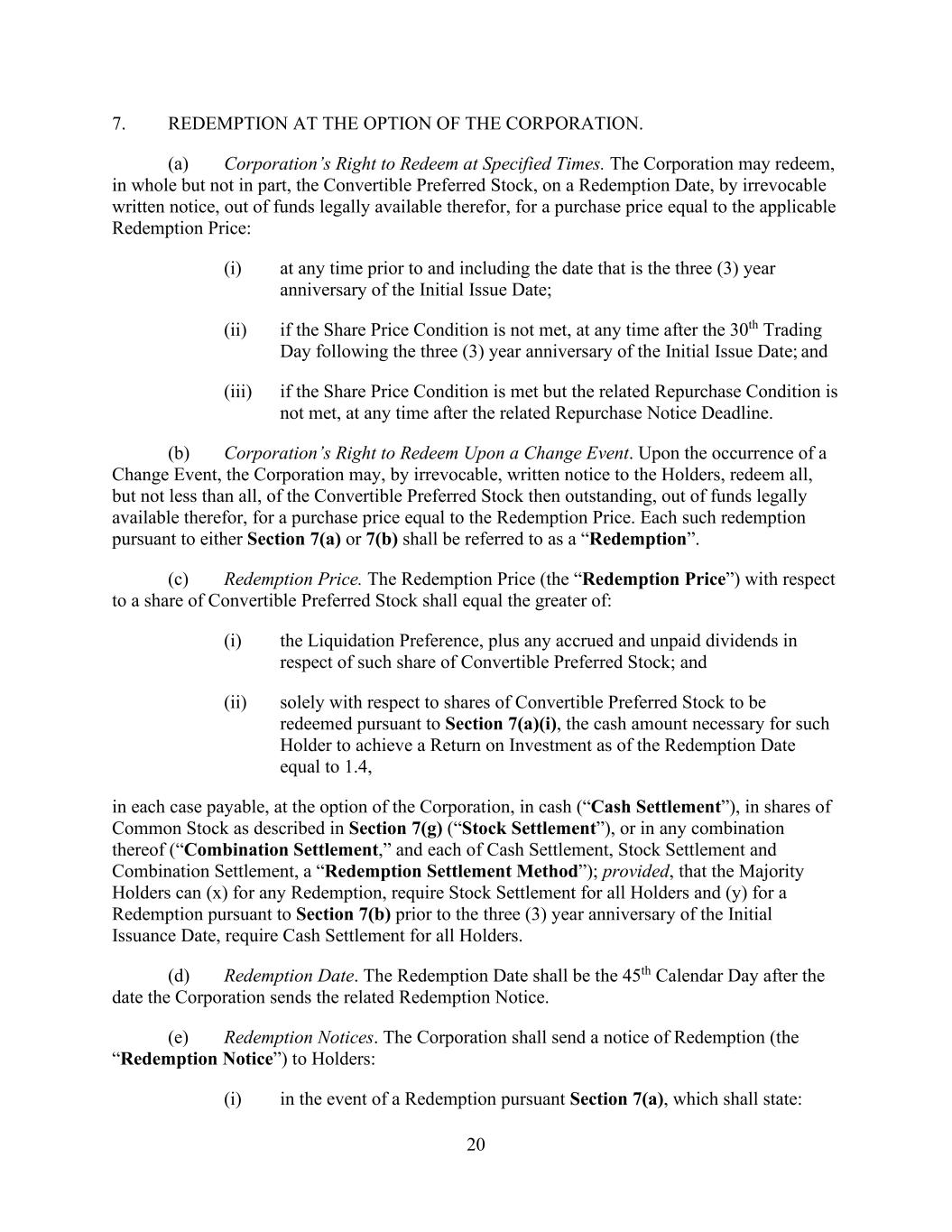 20 7. REDEMPTION AT THE OPTION OF THE CORPORATION. (a) Corporation’s Right to Redeem at Specified Times. The Corporation may redeem, in whole but not in part, the Convertible Preferred Stock, on a Redemption Date, by irrevocable written notice, out of funds legally available therefor, for a purchase price equal to the applicable Redemption Price: (i) at any time prior to and including the date that is the three (3) year anniversary of the Initial Issue Date; (ii) if the Share Price Condition is not met, at any time after the 30th Trading Day following the three (3) year anniversary of the Initial Issue Date; and (iii) if the Share Price Condition is met but the related Repurchase Condition is not met, at any time after the related Repurchase Notice Deadline. (b) Corporation’s Right to Redeem Upon a Change Event. Upon the occurrence of a Change Event, the Corporation may, by irrevocable, written notice to the Holders, redeem all, but not less than all, of the Convertible Preferred Stock then outstanding, out of funds legally available therefor, for a purchase price equal to the Redemption Price. Each such redemption pursuant to either Section 7(a) or 7(b) shall be referred to as a “Redemption”. (c) Redemption Price. The Redemption Price (the “Redemption Price”) with respect to a share of Convertible Preferred Stock shall equal the greater of: (i) the Liquidation Preference, plus any accrued and unpaid dividends in respect of such share of Convertible Preferred Stock; and (ii) solely with respect to shares of Convertible Preferred Stock to be redeemed pursuant to Section 7(a)(i), the cash amount necessary for such Holder to achieve a Return on Investment as of the Redemption Date equal to 1.4, in each case payable, at the option of the Corporation, in cash (“Cash Settlement”), in shares of Common Stock as described in Section 7(g) (“Stock Settlement”), or in any combination thereof (“Combination Settlement,” and each of Cash Settlement, Stock Settlement and Combination Settlement, a “Redemption Settlement Method”); provided, that the Majority Holders can (x) for any Redemption, require Stock Settlement for all Holders and (y) for a Redemption pursuant to Section 7(b) prior to the three (3) year anniversary of the Initial Issuance Date, require Cash Settlement for all Holders. (d) Redemption Date. The Redemption Date shall be the 45th Calendar Day after the date the Corporation sends the related Redemption Notice. (e) Redemption Notices. The Corporation shall send a notice of Redemption (the “Redemption Notice”) to Holders: (i) in the event of a Redemption pursuant Section 7(a), which shall state: