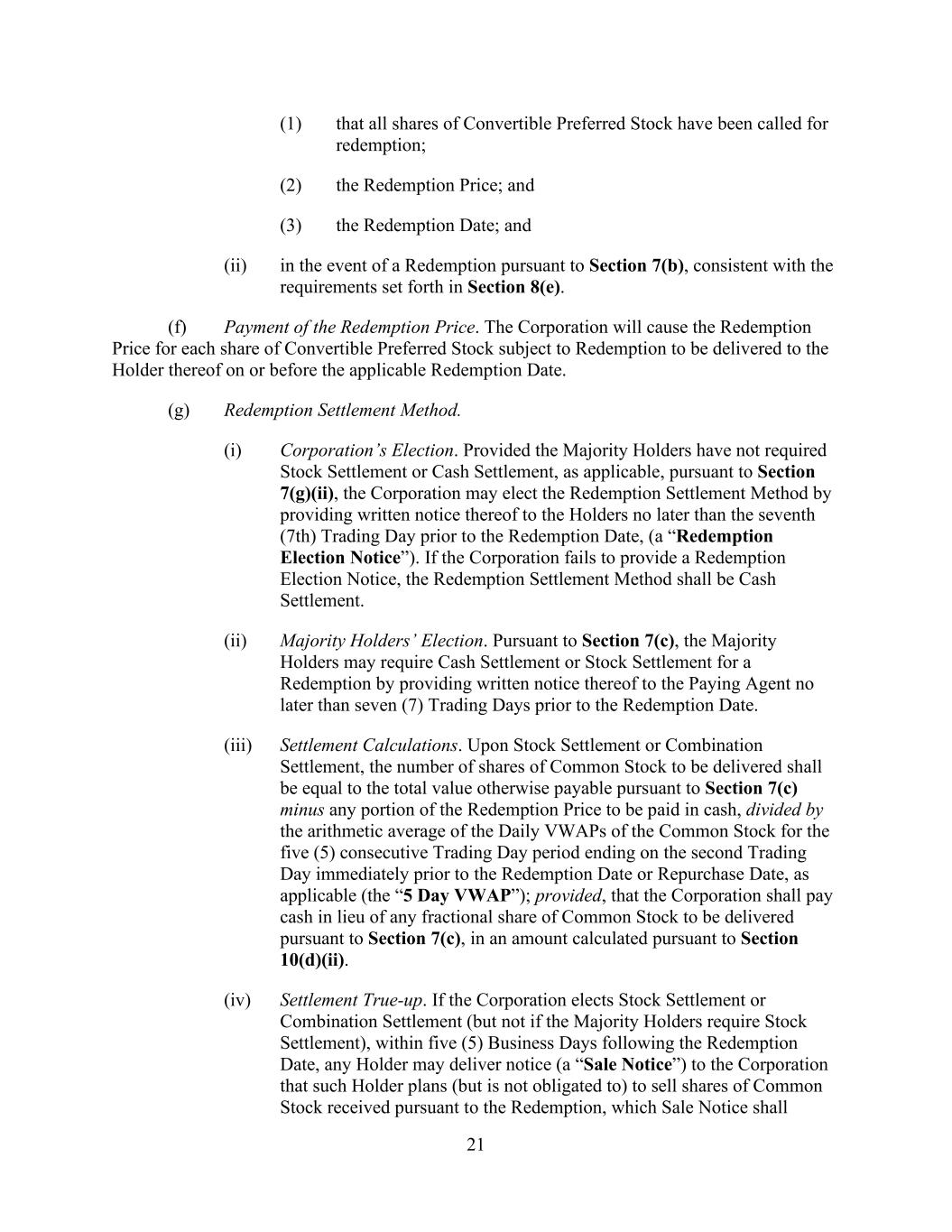 21 (1) that all shares of Convertible Preferred Stock have been called for redemption; (2) the Redemption Price; and (3) the Redemption Date; and (ii) in the event of a Redemption pursuant to Section 7(b), consistent with the requirements set forth in Section 8(e). (f) Payment of the Redemption Price. The Corporation will cause the Redemption Price for each share of Convertible Preferred Stock subject to Redemption to be delivered to the Holder thereof on or before the applicable Redemption Date. (g) Redemption Settlement Method. (i) Corporation’s Election. Provided the Majority Holders have not required Stock Settlement or Cash Settlement, as applicable, pursuant to Section 7(g)(ii), the Corporation may elect the Redemption Settlement Method by providing written notice thereof to the Holders no later than the seventh (7th) Trading Day prior to the Redemption Date, (a “Redemption Election Notice”). If the Corporation fails to provide a Redemption Election Notice, the Redemption Settlement Method shall be Cash Settlement. (ii) Majority Holders’ Election. Pursuant to Section 7(c), the Majority Holders may require Cash Settlement or Stock Settlement for a Redemption by providing written notice thereof to the Paying Agent no later than seven (7) Trading Days prior to the Redemption Date. (iii) Settlement Calculations. Upon Stock Settlement or Combination Settlement, the number of shares of Common Stock to be delivered shall be equal to the total value otherwise payable pursuant to Section 7(c) minus any portion of the Redemption Price to be paid in cash, divided by the arithmetic average of the Daily VWAPs of the Common Stock for the five (5) consecutive Trading Day period ending on the second Trading Day immediately prior to the Redemption Date or Repurchase Date, as applicable (the “5 Day VWAP”); provided, that the Corporation shall pay cash in lieu of any fractional share of Common Stock to be delivered pursuant to Section 7(c), in an amount calculated pursuant to Section 10(d)(ii). (iv) Settlement True-up. If the Corporation elects Stock Settlement or Combination Settlement (but not if the Majority Holders require Stock Settlement), within five (5) Business Days following the Redemption Date, any Holder may deliver notice (a “Sale Notice”) to the Corporation that such Holder plans (but is not obligated to) to sell shares of Common Stock received pursuant to the Redemption, which Sale Notice shall