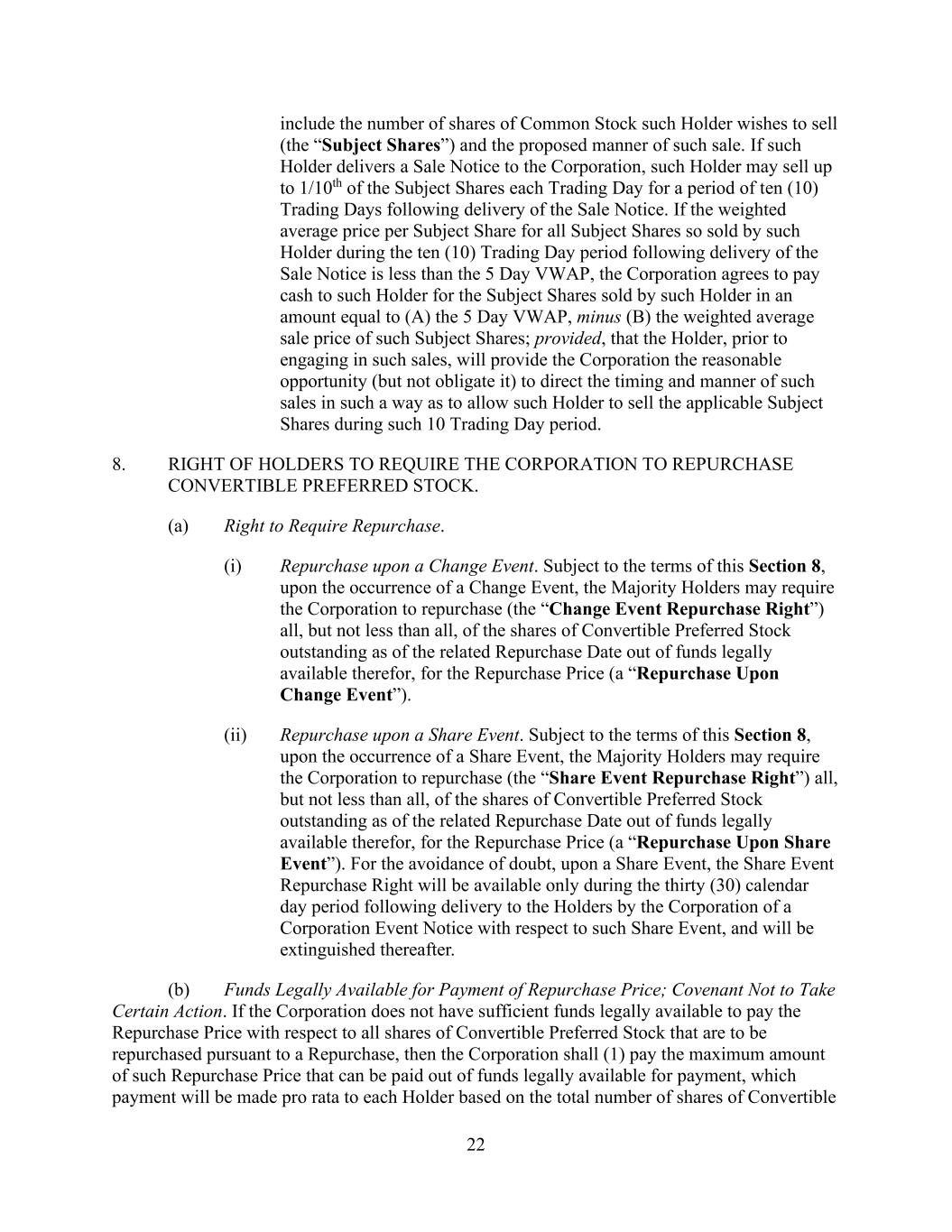 22 include the number of shares of Common Stock such Holder wishes to sell (the “Subject Shares”) and the proposed manner of such sale. If such Holder delivers a Sale Notice to the Corporation, such Holder may sell up to 1/10th of the Subject Shares each Trading Day for a period of ten (10) Trading Days following delivery of the Sale Notice. If the weighted average price per Subject Share for all Subject Shares so sold by such Holder during the ten (10) Trading Day period following delivery of the Sale Notice is less than the 5 Day VWAP, the Corporation agrees to pay cash to such Holder for the Subject Shares sold by such Holder in an amount equal to (A) the 5 Day VWAP, minus (B) the weighted average sale price of such Subject Shares; provided, that the Holder, prior to engaging in such sales, will provide the Corporation the reasonable opportunity (but not obligate it) to direct the timing and manner of such sales in such a way as to allow such Holder to sell the applicable Subject Shares during such 10 Trading Day period. 8. RIGHT OF HOLDERS TO REQUIRE THE CORPORATION TO REPURCHASE CONVERTIBLE PREFERRED STOCK. (a) Right to Require Repurchase. (i) Repurchase upon a Change Event. Subject to the terms of this Section 8, upon the occurrence of a Change Event, the Majority Holders may require the Corporation to repurchase (the “Change Event Repurchase Right”) all, but not less than all, of the shares of Convertible Preferred Stock outstanding as of the related Repurchase Date out of funds legally available therefor, for the Repurchase Price (a “Repurchase Upon Change Event”). (ii) Repurchase upon a Share Event. Subject to the terms of this Section 8, upon the occurrence of a Share Event, the Majority Holders may require the Corporation to repurchase (the “Share Event Repurchase Right”) all, but not less than all, of the shares of Convertible Preferred Stock outstanding as of the related Repurchase Date out of funds legally available therefor, for the Repurchase Price (a “Repurchase Upon Share Event”). For the avoidance of doubt, upon a Share Event, the Share Event Repurchase Right will be available only during the thirty (30) calendar day period following delivery to the Holders by the Corporation of a Corporation Event Notice with respect to such Share Event, and will be extinguished thereafter. (b) Funds Legally Available for Payment of Repurchase Price; Covenant Not to Take Certain Action. If the Corporation does not have sufficient funds legally available to pay the Repurchase Price with respect to all shares of Convertible Preferred Stock that are to be repurchased pursuant to a Repurchase, then the Corporation shall (1) pay the maximum amount of such Repurchase Price that can be paid out of funds legally available for payment, which payment will be made pro rata to each Holder based on the total number of shares of Convertible