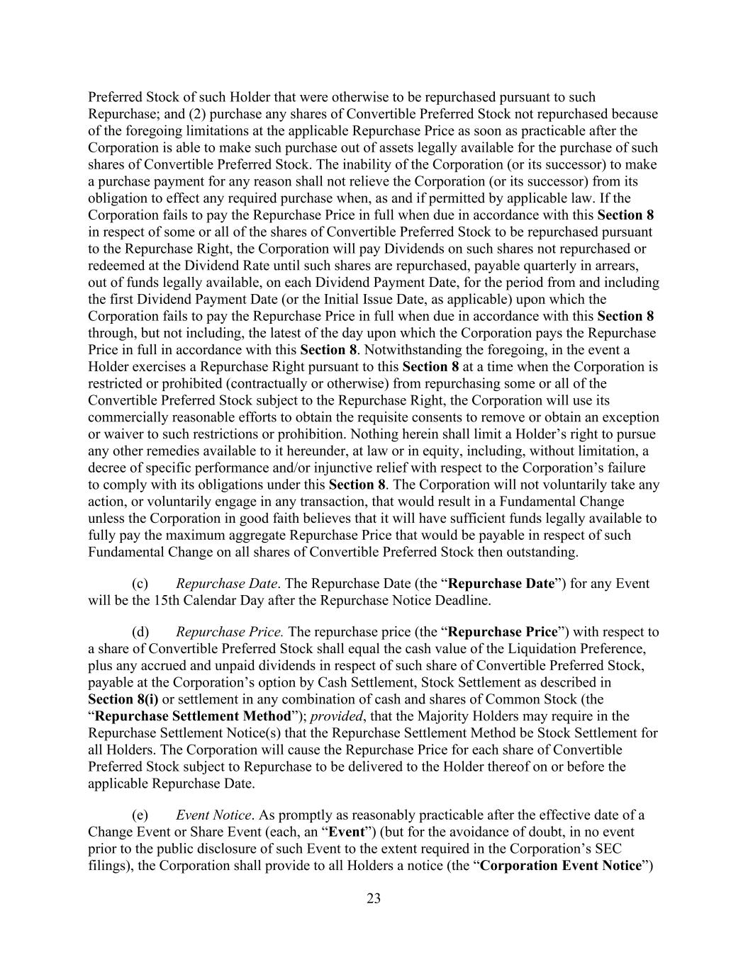 23 Preferred Stock of such Holder that were otherwise to be repurchased pursuant to such Repurchase; and (2) purchase any shares of Convertible Preferred Stock not repurchased because of the foregoing limitations at the applicable Repurchase Price as soon as practicable after the Corporation is able to make such purchase out of assets legally available for the purchase of such shares of Convertible Preferred Stock. The inability of the Corporation (or its successor) to make a purchase payment for any reason shall not relieve the Corporation (or its successor) from its obligation to effect any required purchase when, as and if permitted by applicable law. If the Corporation fails to pay the Repurchase Price in full when due in accordance with this Section 8 in respect of some or all of the shares of Convertible Preferred Stock to be repurchased pursuant to the Repurchase Right, the Corporation will pay Dividends on such shares not repurchased or redeemed at the Dividend Rate until such shares are repurchased, payable quarterly in arrears, out of funds legally available, on each Dividend Payment Date, for the period from and including the first Dividend Payment Date (or the Initial Issue Date, as applicable) upon which the Corporation fails to pay the Repurchase Price in full when due in accordance with this Section 8 through, but not including, the latest of the day upon which the Corporation pays the Repurchase Price in full in accordance with this Section 8. Notwithstanding the foregoing, in the event a Holder exercises a Repurchase Right pursuant to this Section 8 at a time when the Corporation is restricted or prohibited (contractually or otherwise) from repurchasing some or all of the Convertible Preferred Stock subject to the Repurchase Right, the Corporation will use its commercially reasonable efforts to obtain the requisite consents to remove or obtain an exception or waiver to such restrictions or prohibition. Nothing herein shall limit a Holder’s right to pursue any other remedies available to it hereunder, at law or in equity, including, without limitation, a decree of specific performance and/or injunctive relief with respect to the Corporation’s failure to comply with its obligations under this Section 8. The Corporation will not voluntarily take any action, or voluntarily engage in any transaction, that would result in a Fundamental Change unless the Corporation in good faith believes that it will have sufficient funds legally available to fully pay the maximum aggregate Repurchase Price that would be payable in respect of such Fundamental Change on all shares of Convertible Preferred Stock then outstanding. (c) Repurchase Date. The Repurchase Date (the “Repurchase Date”) for any Event will be the 15th Calendar Day after the Repurchase Notice Deadline. (d) Repurchase Price. The repurchase price (the “Repurchase Price”) with respect to a share of Convertible Preferred Stock shall equal the cash value of the Liquidation Preference, plus any accrued and unpaid dividends in respect of such share of Convertible Preferred Stock, payable at the Corporation’s option by Cash Settlement, Stock Settlement as described in Section 8(i) or settlement in any combination of cash and shares of Common Stock (the “Repurchase Settlement Method”); provided, that the Majority Holders may require in the Repurchase Settlement Notice(s) that the Repurchase Settlement Method be Stock Settlement for all Holders. The Corporation will cause the Repurchase Price for each share of Convertible Preferred Stock subject to Repurchase to be delivered to the Holder thereof on or before the applicable Repurchase Date. (e) Event Notice. As promptly as reasonably practicable after the effective date of a Change Event or Share Event (each, an “Event”) (but for the avoidance of doubt, in no event prior to the public disclosure of such Event to the extent required in the Corporation’s SEC filings), the Corporation shall provide to all Holders a notice (the “Corporation Event Notice”)