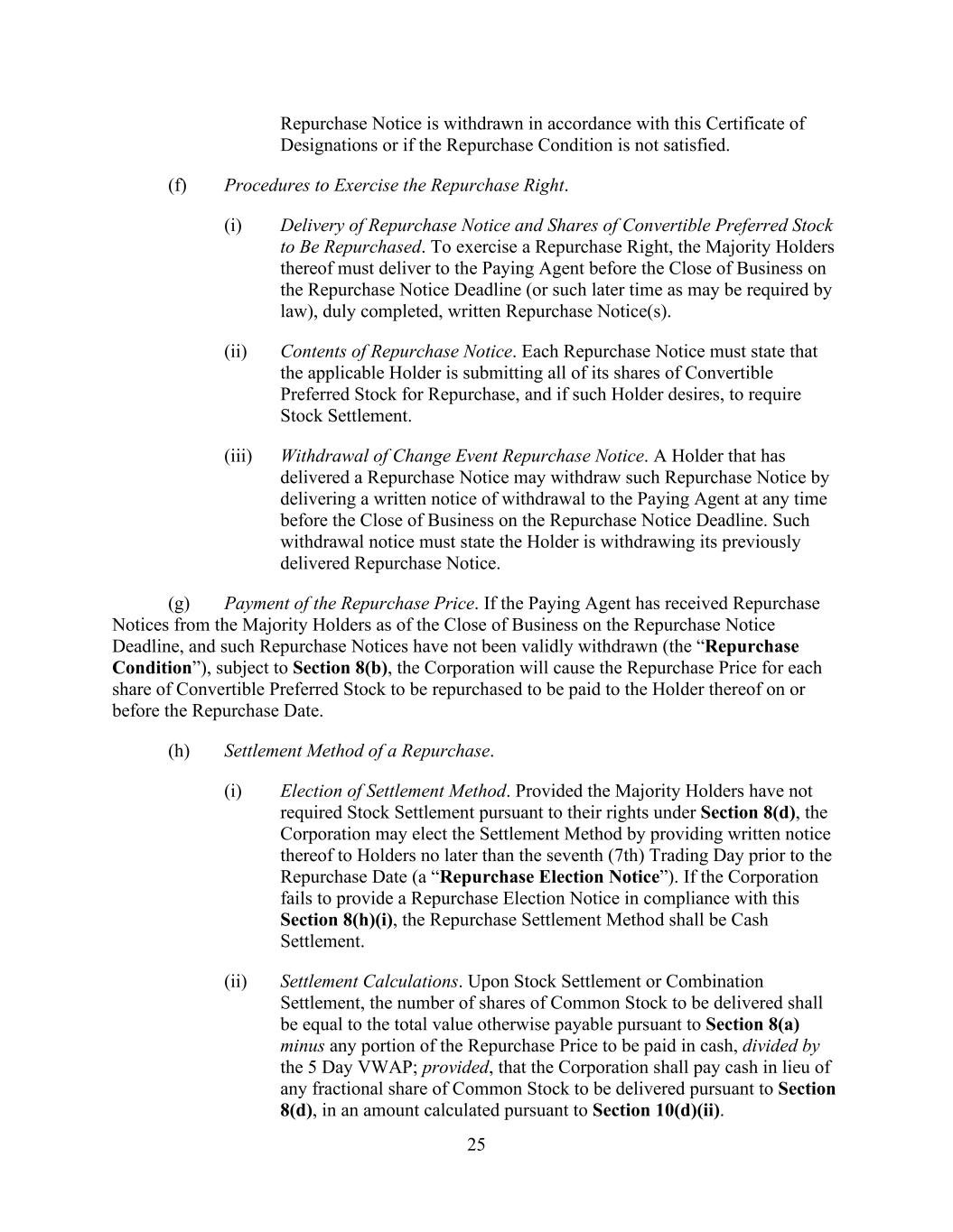 25 Repurchase Notice is withdrawn in accordance with this Certificate of Designations or if the Repurchase Condition is not satisfied. (f) Procedures to Exercise the Repurchase Right. (i) Delivery of Repurchase Notice and Shares of Convertible Preferred Stock to Be Repurchased. To exercise a Repurchase Right, the Majority Holders thereof must deliver to the Paying Agent before the Close of Business on the Repurchase Notice Deadline (or such later time as may be required by law), duly completed, written Repurchase Notice(s). (ii) Contents of Repurchase Notice. Each Repurchase Notice must state that the applicable Holder is submitting all of its shares of Convertible Preferred Stock for Repurchase, and if such Holder desires, to require Stock Settlement. (iii) Withdrawal of Change Event Repurchase Notice. A Holder that has delivered a Repurchase Notice may withdraw such Repurchase Notice by delivering a written notice of withdrawal to the Paying Agent at any time before the Close of Business on the Repurchase Notice Deadline. Such withdrawal notice must state the Holder is withdrawing its previously delivered Repurchase Notice. (g) Payment of the Repurchase Price. If the Paying Agent has received Repurchase Notices from the Majority Holders as of the Close of Business on the Repurchase Notice Deadline, and such Repurchase Notices have not been validly withdrawn (the “Repurchase Condition”), subject to Section 8(b), the Corporation will cause the Repurchase Price for each share of Convertible Preferred Stock to be repurchased to be paid to the Holder thereof on or before the Repurchase Date. (h) Settlement Method of a Repurchase. (i) Election of Settlement Method. Provided the Majority Holders have not required Stock Settlement pursuant to their rights under Section 8(d), the Corporation may elect the Settlement Method by providing written notice thereof to Holders no later than the seventh (7th) Trading Day prior to the Repurchase Date (a “Repurchase Election Notice”). If the Corporation fails to provide a Repurchase Election Notice in compliance with this Section 8(h)(i), the Repurchase Settlement Method shall be Cash Settlement. (ii) Settlement Calculations. Upon Stock Settlement or Combination Settlement, the number of shares of Common Stock to be delivered shall be equal to the total value otherwise payable pursuant to Section 8(a) minus any portion of the Repurchase Price to be paid in cash, divided by the 5 Day VWAP; provided, that the Corporation shall pay cash in lieu of any fractional share of Common Stock to be delivered pursuant to Section 8(d), in an amount calculated pursuant to Section 10(d)(ii).