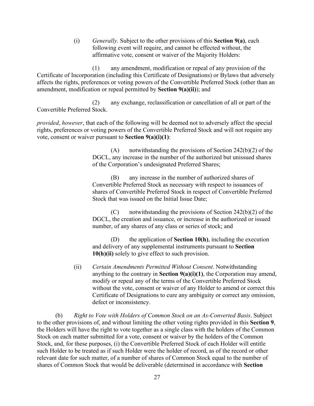27 (i) Generally. Subject to the other provisions of this Section 9(a), each following event will require, and cannot be effected without, the affirmative vote, consent or waiver of the Majority Holders: (1) any amendment, modification or repeal of any provision of the Certificate of Incorporation (including this Certificate of Designations) or Bylaws that adversely affects the rights, preferences or voting powers of the Convertible Preferred Stock (other than an amendment, modification or repeal permitted by Section 9(a)(ii)); and (2) any exchange, reclassification or cancellation of all or part of the Convertible Preferred Stock. provided, however, that each of the following will be deemed not to adversely affect the special rights, preferences or voting powers of the Convertible Preferred Stock and will not require any vote, consent or waiver pursuant to Section 9(a)(i)(1): (A) notwithstanding the provisions of Section 242(b)(2) of the DGCL, any increase in the number of the authorized but unissued shares of the Corporation’s undesignated Preferred Shares; (B) any increase in the number of authorized shares of Convertible Preferred Stock as necessary with respect to issuances of shares of Convertible Preferred Stock in respect of Convertible Preferred Stock that was issued on the Initial Issue Date; (C) notwithstanding the provisions of Section 242(b)(2) of the DGCL, the creation and issuance, or increase in the authorized or issued number, of any shares of any class or series of stock; and (D) the application of Section 10(h), including the execution and delivery of any supplemental instruments pursuant to Section 10(h)(ii) solely to give effect to such provision. (ii) Certain Amendments Permitted Without Consent. Notwithstanding anything to the contrary in Section 9(a)(i)(1), the Corporation may amend, modify or repeal any of the terms of the Convertible Preferred Stock without the vote, consent or waiver of any Holder to amend or correct this Certificate of Designations to cure any ambiguity or correct any omission, defect or inconsistency. (b) Right to Vote with Holders of Common Stock on an As-Converted Basis. Subject to the other provisions of, and without limiting the other voting rights provided in this Section 9, the Holders will have the right to vote together as a single class with the holders of the Common Stock on each matter submitted for a vote, consent or waiver by the holders of the Common Stock, and, for these purposes, (i) the Convertible Preferred Stock of each Holder will entitle such Holder to be treated as if such Holder were the holder of record, as of the record or other relevant date for such matter, of a number of shares of Common Stock equal to the number of shares of Common Stock that would be deliverable (determined in accordance with Section