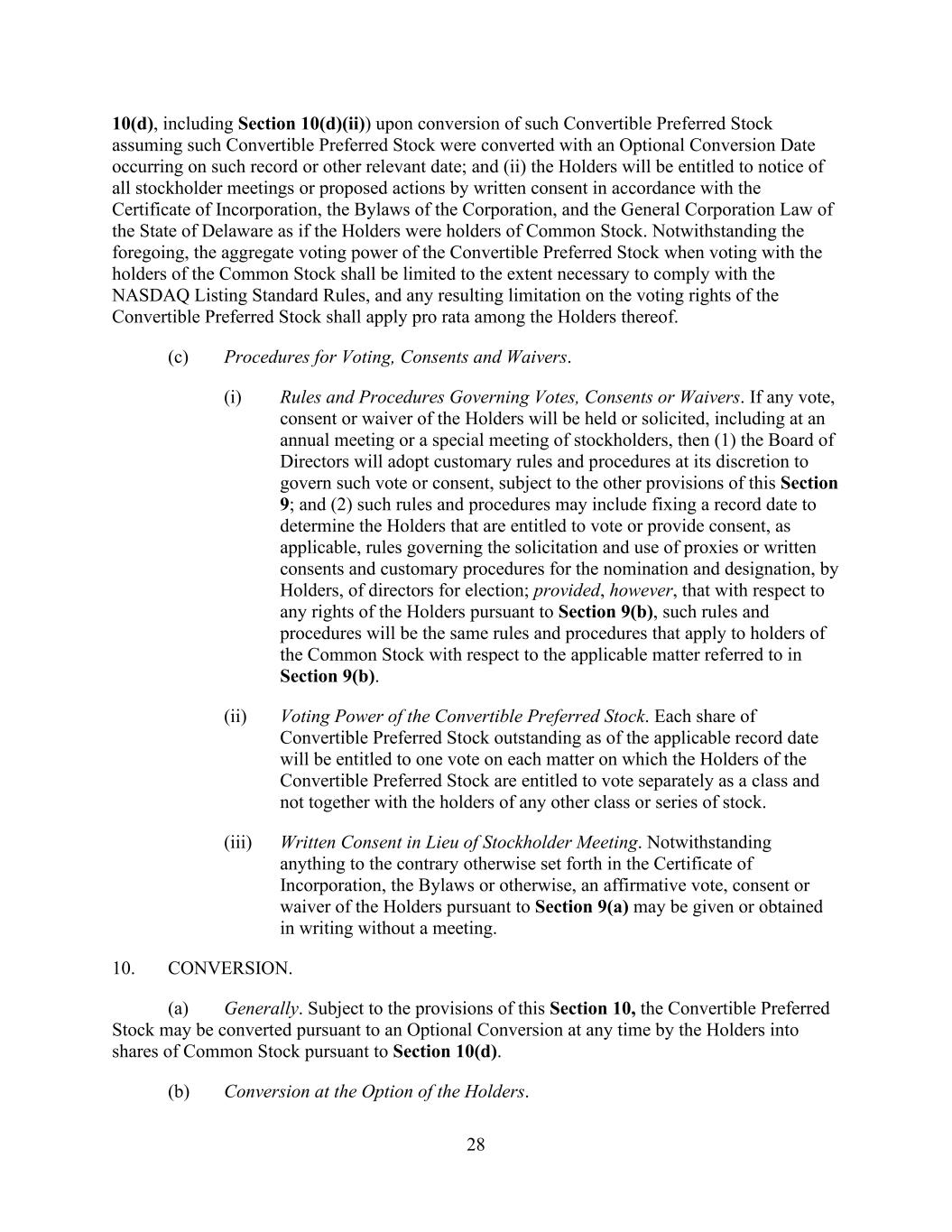 28 10(d), including Section 10(d)(ii)) upon conversion of such Convertible Preferred Stock assuming such Convertible Preferred Stock were converted with an Optional Conversion Date occurring on such record or other relevant date; and (ii) the Holders will be entitled to notice of all stockholder meetings or proposed actions by written consent in accordance with the Certificate of Incorporation, the Bylaws of the Corporation, and the General Corporation Law of the State of Delaware as if the Holders were holders of Common Stock. Notwithstanding the foregoing, the aggregate voting power of the Convertible Preferred Stock when voting with the holders of the Common Stock shall be limited to the extent necessary to comply with the NASDAQ Listing Standard Rules, and any resulting limitation on the voting rights of the Convertible Preferred Stock shall apply pro rata among the Holders thereof. (c) Procedures for Voting, Consents and Waivers. (i) Rules and Procedures Governing Votes, Consents or Waivers. If any vote, consent or waiver of the Holders will be held or solicited, including at an annual meeting or a special meeting of stockholders, then (1) the Board of Directors will adopt customary rules and procedures at its discretion to govern such vote or consent, subject to the other provisions of this Section 9; and (2) such rules and procedures may include fixing a record date to determine the Holders that are entitled to vote or provide consent, as applicable, rules governing the solicitation and use of proxies or written consents and customary procedures for the nomination and designation, by Holders, of directors for election; provided, however, that with respect to any rights of the Holders pursuant to Section 9(b), such rules and procedures will be the same rules and procedures that apply to holders of the Common Stock with respect to the applicable matter referred to in Section 9(b). (ii) Voting Power of the Convertible Preferred Stock. Each share of Convertible Preferred Stock outstanding as of the applicable record date will be entitled to one vote on each matter on which the Holders of the Convertible Preferred Stock are entitled to vote separately as a class and not together with the holders of any other class or series of stock. (iii) Written Consent in Lieu of Stockholder Meeting. Notwithstanding anything to the contrary otherwise set forth in the Certificate of Incorporation, the Bylaws or otherwise, an affirmative vote, consent or waiver of the Holders pursuant to Section 9(a) may be given or obtained in writing without a meeting. 10. CONVERSION. (a) Generally. Subject to the provisions of this Section 10, the Convertible Preferred Stock may be converted pursuant to an Optional Conversion at any time by the Holders into shares of Common Stock pursuant to Section 10(d). (b) Conversion at the Option of the Holders.