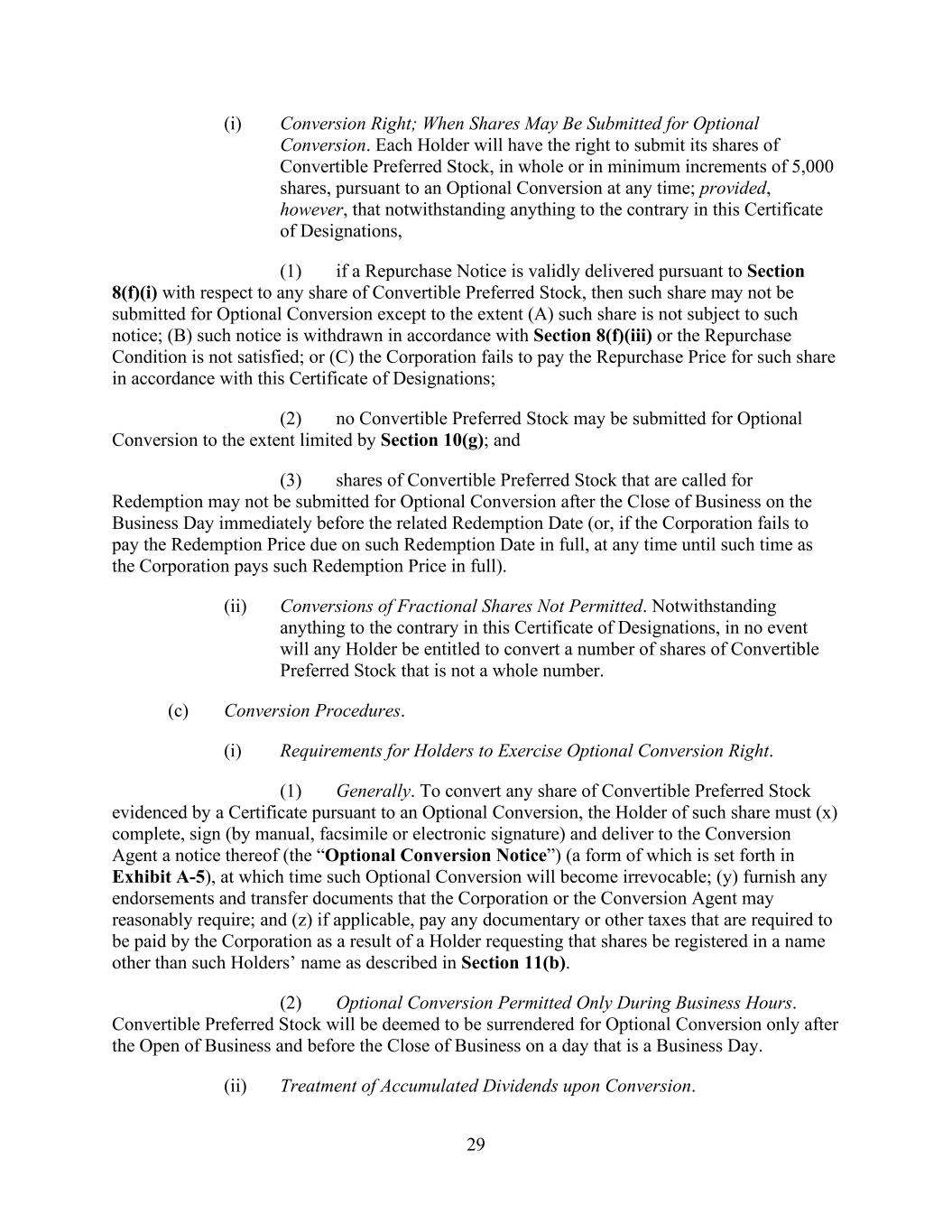 29 (i) Conversion Right; When Shares May Be Submitted for Optional Conversion. Each Holder will have the right to submit its shares of Convertible Preferred Stock, in whole or in minimum increments of 5,000 shares, pursuant to an Optional Conversion at any time; provided, however, that notwithstanding anything to the contrary in this Certificate of Designations, (1) if a Repurchase Notice is validly delivered pursuant to Section 8(f)(i) with respect to any share of Convertible Preferred Stock, then such share may not be submitted for Optional Conversion except to the extent (A) such share is not subject to such notice; (B) such notice is withdrawn in accordance with Section 8(f)(iii) or the Repurchase Condition is not satisfied; or (C) the Corporation fails to pay the Repurchase Price for such share in accordance with this Certificate of Designations; (2) no Convertible Preferred Stock may be submitted for Optional Conversion to the extent limited by Section 10(g); and (3) shares of Convertible Preferred Stock that are called for Redemption may not be submitted for Optional Conversion after the Close of Business on the Business Day immediately before the related Redemption Date (or, if the Corporation fails to pay the Redemption Price due on such Redemption Date in full, at any time until such time as the Corporation pays such Redemption Price in full). (ii) Conversions of Fractional Shares Not Permitted. Notwithstanding anything to the contrary in this Certificate of Designations, in no event will any Holder be entitled to convert a number of shares of Convertible Preferred Stock that is not a whole number. (c) Conversion Procedures. (i) Requirements for Holders to Exercise Optional Conversion Right. (1) Generally. To convert any share of Convertible Preferred Stock evidenced by a Certificate pursuant to an Optional Conversion, the Holder of such share must (x) complete, sign (by manual, facsimile or electronic signature) and deliver to the Conversion Agent a notice thereof (the “Optional Conversion Notice”) (a form of which is set forth in Exhibit A-5), at which time such Optional Conversion will become irrevocable; (y) furnish any endorsements and transfer documents that the Corporation or the Conversion Agent may reasonably require; and (z) if applicable, pay any documentary or other taxes that are required to be paid by the Corporation as a result of a Holder requesting that shares be registered in a name other than such Holders’ name as described in Section 11(b). (2) Optional Conversion Permitted Only During Business Hours. Convertible Preferred Stock will be deemed to be surrendered for Optional Conversion only after the Open of Business and before the Close of Business on a day that is a Business Day. (ii) Treatment of Accumulated Dividends upon Conversion.