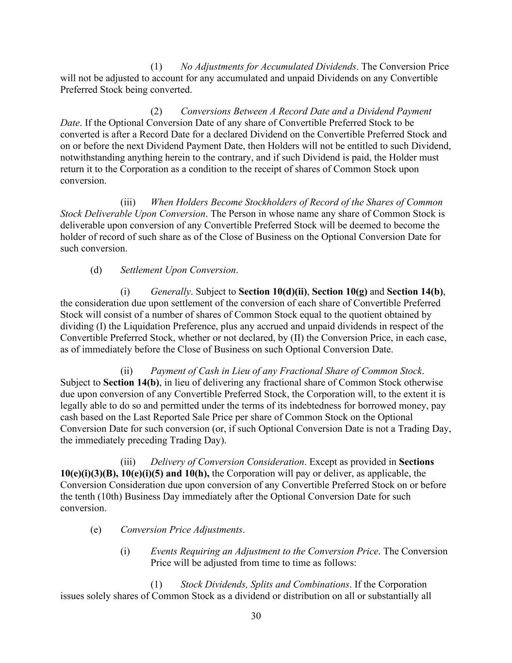 30 (1) No Adjustments for Accumulated Dividends. The Conversion Price will not be adjusted to account for any accumulated and unpaid Dividends on any Convertible Preferred Stock being converted. (2) Conversions Between A Record Date and a Dividend Payment Date. If the Optional Conversion Date of any share of Convertible Preferred Stock to be converted is after a Record Date for a declared Dividend on the Convertible Preferred Stock and on or before the next Dividend Payment Date, then Holders will not be entitled to such Dividend, notwithstanding anything herein to the contrary, and if such Dividend is paid, the Holder must return it to the Corporation as a condition to the receipt of shares of Common Stock upon conversion. (iii) When Holders Become Stockholders of Record of the Shares of Common Stock Deliverable Upon Conversion. The Person in whose name any share of Common Stock is deliverable upon conversion of any Convertible Preferred Stock will be deemed to become the holder of record of such share as of the Close of Business on the Optional Conversion Date for such conversion. (d) Settlement Upon Conversion. (i) Generally. Subject to Section 10(d)(ii), Section 10(g) and Section 14(b), the consideration due upon settlement of the conversion of each share of Convertible Preferred Stock will consist of a number of shares of Common Stock equal to the quotient obtained by dividing (I) the Liquidation Preference, plus any accrued and unpaid dividends in respect of the Convertible Preferred Stock, whether or not declared, by (II) the Conversion Price, in each case, as of immediately before the Close of Business on such Optional Conversion Date. (ii) Payment of Cash in Lieu of any Fractional Share of Common Stock. Subject to Section 14(b), in lieu of delivering any fractional share of Common Stock otherwise due upon conversion of any Convertible Preferred Stock, the Corporation will, to the extent it is legally able to do so and permitted under the terms of its indebtedness for borrowed money, pay cash based on the Last Reported Sale Price per share of Common Stock on the Optional Conversion Date for such conversion (or, if such Optional Conversion Date is not a Trading Day, the immediately preceding Trading Day). (iii) Delivery of Conversion Consideration. Except as provided in Sections 10(e)(i)(3)(B), 10(e)(i)(5) and 10(h), the Corporation will pay or deliver, as applicable, the Conversion Consideration due upon conversion of any Convertible Preferred Stock on or before the tenth (10th) Business Day immediately after the Optional Conversion Date for such conversion. (e) Conversion Price Adjustments. (i) Events Requiring an Adjustment to the Conversion Price. The Conversion Price will be adjusted from time to time as follows: (1) Stock Dividends, Splits and Combinations. If the Corporation issues solely shares of Common Stock as a dividend or distribution on all or substantially all
