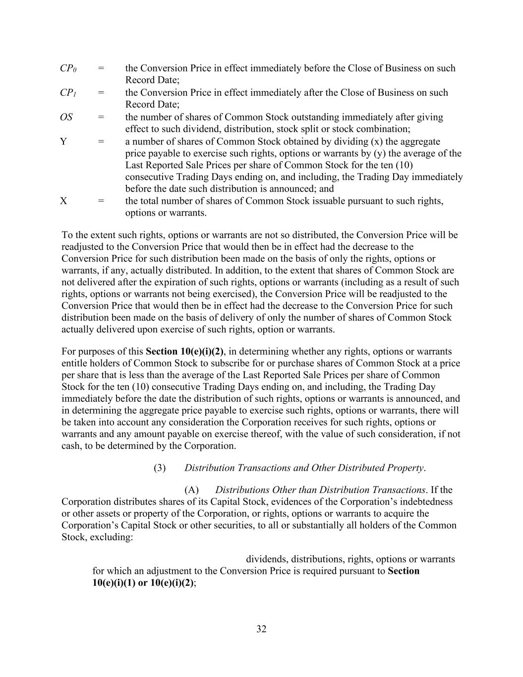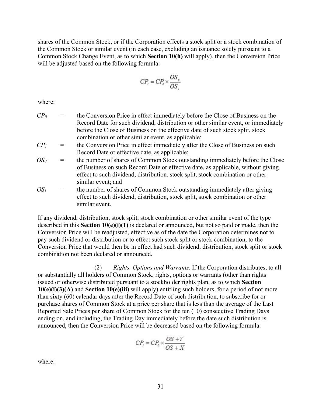 31 shares of the Common Stock, or if the Corporation effects a stock split or a stock combination of the Common Stock or similar event (in each case, excluding an issuance solely pursuant to a Common Stock Change Event, as to which Section 10(h) will apply), then the Conversion Price will be adjusted based on the following formula: where: CP0 = the Conversion Price in effect immediately before the Close of Business on the Record Date for such dividend, distribution or other similar event, or immediately before the Close of Business on the effective date of such stock split, stock combination or other similar event, as applicable; CP1 = the Conversion Price in effect immediately after the Close of Business on such Record Date or effective date, as applicable; OS0 = the number of shares of Common Stock outstanding immediately before the Close of Business on such Record Date or effective date, as applicable, without giving effect to such dividend, distribution, stock split, stock combination or other similar event; and OS1 = the number of shares of Common Stock outstanding immediately after giving effect to such dividend, distribution, stock split, stock combination or other similar event. If any dividend, distribution, stock split, stock combination or other similar event of the type described in this Section 10(e)(i)(1) is declared or announced, but not so paid or made, then the Conversion Price will be readjusted, effective as of the date the Corporation determines not to pay such dividend or distribution or to effect such stock split or stock combination, to the Conversion Price that would then be in effect had such dividend, distribution, stock split or stock combination not been declared or announced. (2) Rights, Options and Warrants. If the Corporation distributes, to all or substantially all holders of Common Stock, rights, options or warrants (other than rights issued or otherwise distributed pursuant to a stockholder rights plan, as to which Section 10(e)(i)(3)(A) and Section 10(e)(iii) will apply) entitling such holders, for a period of not more than sixty (60) calendar days after the Record Date of such distribution, to subscribe for or purchase shares of Common Stock at a price per share that is less than the average of the Last Reported Sale Prices per share of Common Stock for the ten (10) consecutive Trading Days ending on, and including, the Trading Day immediately before the date such distribution is announced, then the Conversion Price will be decreased based on the following formula: where: