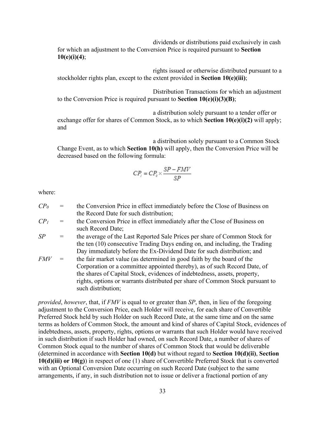 33 dividends or distributions paid exclusively in cash for which an adjustment to the Conversion Price is required pursuant to Section 10(e)(i)(4); rights issued or otherwise distributed pursuant to a stockholder rights plan, except to the extent provided in Section 10(e)(iii); Distribution Transactions for which an adjustment to the Conversion Price is required pursuant to Section 10(e)(i)(3)(B); a distribution solely pursuant to a tender offer or exchange offer for shares of Common Stock, as to which Section 10(e)(i)(2) will apply; and a distribution solely pursuant to a Common Stock Change Event, as to which Section 10(h) will apply, then the Conversion Price will be decreased based on the following formula: where: CP0 = the Conversion Price in effect immediately before the Close of Business on the Record Date for such distribution; CP1 = the Conversion Price in effect immediately after the Close of Business on such Record Date; SP = the average of the Last Reported Sale Prices per share of Common Stock for the ten (10) consecutive Trading Days ending on, and including, the Trading Day immediately before the Ex-Dividend Date for such distribution; and FMV = the fair market value (as determined in good faith by the board of the Corporation or a committee appointed thereby), as of such Record Date, of the shares of Capital Stock, evidences of indebtedness, assets, property, rights, options or warrants distributed per share of Common Stock pursuant to such distribution; provided, however, that, if FMV is equal to or greater than SP, then, in lieu of the foregoing adjustment to the Conversion Price, each Holder will receive, for each share of Convertible Preferred Stock held by such Holder on such Record Date, at the same time and on the same terms as holders of Common Stock, the amount and kind of shares of Capital Stock, evidences of indebtedness, assets, property, rights, options or warrants that such Holder would have received in such distribution if such Holder had owned, on such Record Date, a number of shares of Common Stock equal to the number of shares of Common Stock that would be deliverable (determined in accordance with Section 10(d) but without regard to Section 10(d)(ii), Section 10(d)(iii) or 10(g)) in respect of one (1) share of Convertible Preferred Stock that is converted with an Optional Conversion Date occurring on such Record Date (subject to the same arrangements, if any, in such distribution not to issue or deliver a fractional portion of any