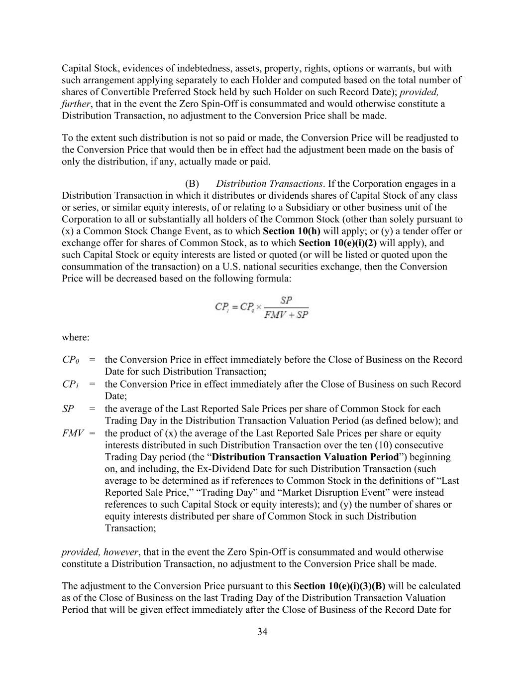 34 Capital Stock, evidences of indebtedness, assets, property, rights, options or warrants, but with such arrangement applying separately to each Holder and computed based on the total number of shares of Convertible Preferred Stock held by such Holder on such Record Date); provided, further, that in the event the Zero Spin-Off is consummated and would otherwise constitute a Distribution Transaction, no adjustment to the Conversion Price shall be made. To the extent such distribution is not so paid or made, the Conversion Price will be readjusted to the Conversion Price that would then be in effect had the adjustment been made on the basis of only the distribution, if any, actually made or paid. (B) Distribution Transactions. If the Corporation engages in a Distribution Transaction in which it distributes or dividends shares of Capital Stock of any class or series, or similar equity interests, of or relating to a Subsidiary or other business unit of the Corporation to all or substantially all holders of the Common Stock (other than solely pursuant to (x) a Common Stock Change Event, as to which Section 10(h) will apply; or (y) a tender offer or exchange offer for shares of Common Stock, as to which Section 10(e)(i)(2) will apply), and such Capital Stock or equity interests are listed or quoted (or will be listed or quoted upon the consummation of the transaction) on a U.S. national securities exchange, then the Conversion Price will be decreased based on the following formula: where: CP0 = the Conversion Price in effect immediately before the Close of Business on the Record Date for such Distribution Transaction; CP1 = the Conversion Price in effect immediately after the Close of Business on such Record Date; SP = the average of the Last Reported Sale Prices per share of Common Stock for each Trading Day in the Distribution Transaction Valuation Period (as defined below); and FMV = the product of (x) the average of the Last Reported Sale Prices per share or equity interests distributed in such Distribution Transaction over the ten (10) consecutive Trading Day period (the “Distribution Transaction Valuation Period”) beginning on, and including, the Ex-Dividend Date for such Distribution Transaction (such average to be determined as if references to Common Stock in the definitions of “Last Reported Sale Price,” “Trading Day” and “Market Disruption Event” were instead references to such Capital Stock or equity interests); and (y) the number of shares or equity interests distributed per share of Common Stock in such Distribution Transaction; provided, however, that in the event the Zero Spin-Off is consummated and would otherwise constitute a Distribution Transaction, no adjustment to the Conversion Price shall be made. The adjustment to the Conversion Price pursuant to this Section 10(e)(i)(3)(B) will be calculated as of the Close of Business on the last Trading Day of the Distribution Transaction Valuation Period that will be given effect immediately after the Close of Business of the Record Date for