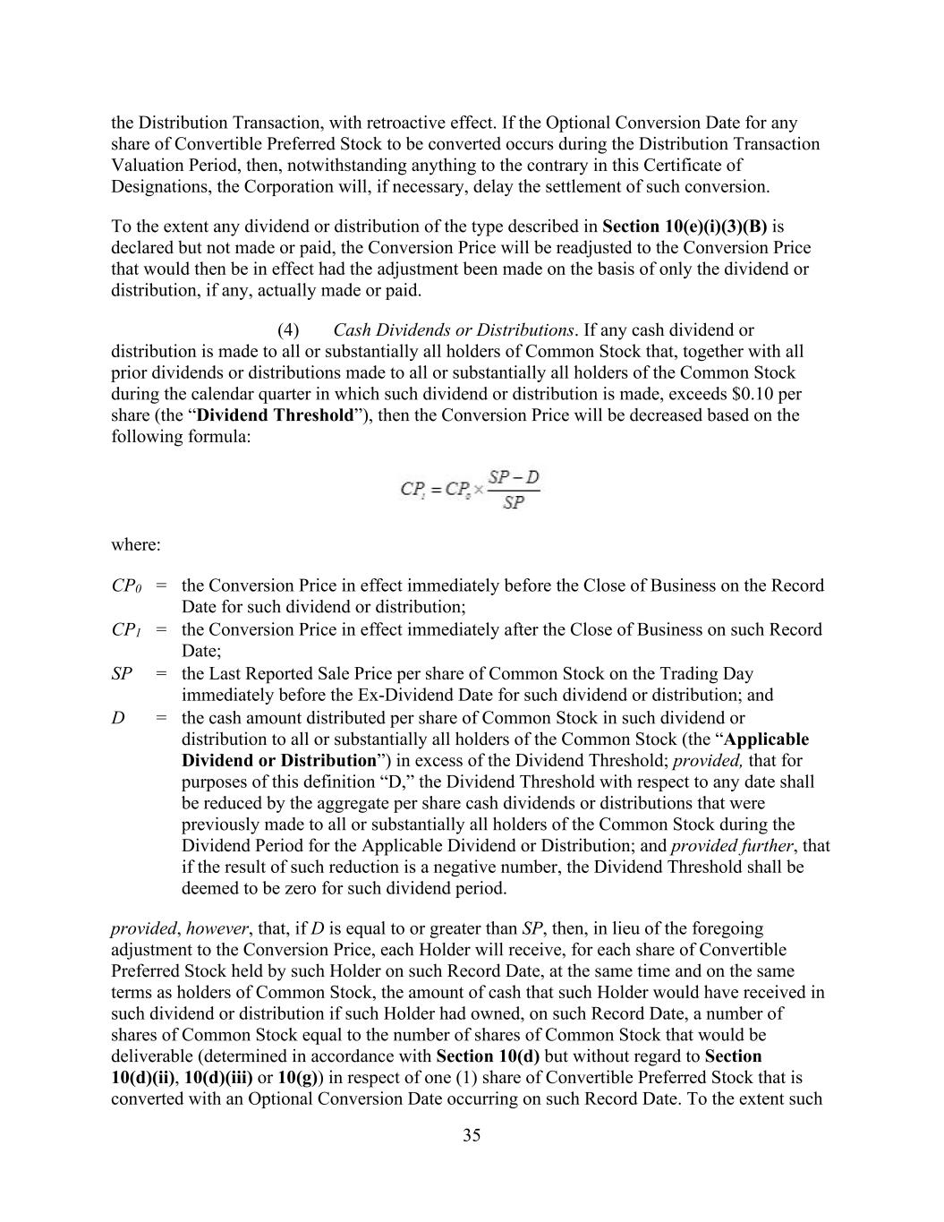 35 the Distribution Transaction, with retroactive effect. If the Optional Conversion Date for any share of Convertible Preferred Stock to be converted occurs during the Distribution Transaction Valuation Period, then, notwithstanding anything to the contrary in this Certificate of Designations, the Corporation will, if necessary, delay the settlement of such conversion. To the extent any dividend or distribution of the type described in Section 10(e)(i)(3)(B) is declared but not made or paid, the Conversion Price will be readjusted to the Conversion Price that would then be in effect had the adjustment been made on the basis of only the dividend or distribution, if any, actually made or paid. (4) Cash Dividends or Distributions. If any cash dividend or distribution is made to all or substantially all holders of Common Stock that, together with all prior dividends or distributions made to all or substantially all holders of the Common Stock during the calendar quarter in which such dividend or distribution is made, exceeds $0.10 per share (the “Dividend Threshold”), then the Conversion Price will be decreased based on the following formula: where: CP0 = the Conversion Price in effect immediately before the Close of Business on the Record Date for such dividend or distribution; CP1 = the Conversion Price in effect immediately after the Close of Business on such Record Date; SP = the Last Reported Sale Price per share of Common Stock on the Trading Day immediately before the Ex-Dividend Date for such dividend or distribution; and D = the cash amount distributed per share of Common Stock in such dividend or distribution to all or substantially all holders of the Common Stock (the “Applicable Dividend or Distribution”) in excess of the Dividend Threshold; provided, that for purposes of this definition “D,” the Dividend Threshold with respect to any date shall be reduced by the aggregate per share cash dividends or distributions that were previously made to all or substantially all holders of the Common Stock during the Dividend Period for the Applicable Dividend or Distribution; and provided further, that if the result of such reduction is a negative number, the Dividend Threshold shall be deemed to be zero for such dividend period. provided, however, that, if D is equal to or greater than SP, then, in lieu of the foregoing adjustment to the Conversion Price, each Holder will receive, for each share of Convertible Preferred Stock held by such Holder on such Record Date, at the same time and on the same terms as holders of Common Stock, the amount of cash that such Holder would have received in such dividend or distribution if such Holder had owned, on such Record Date, a number of shares of Common Stock equal to the number of shares of Common Stock that would be deliverable (determined in accordance with Section 10(d) but without regard to Section 10(d)(ii), 10(d)(iii) or 10(g)) in respect of one (1) share of Convertible Preferred Stock that is converted with an Optional Conversion Date occurring on such Record Date. To the extent such